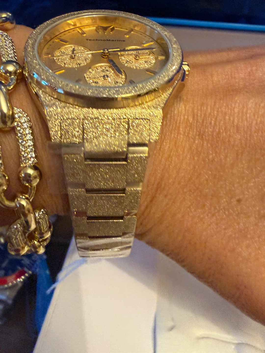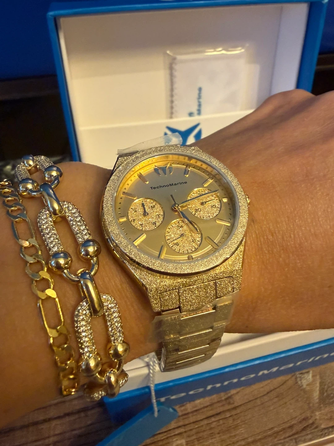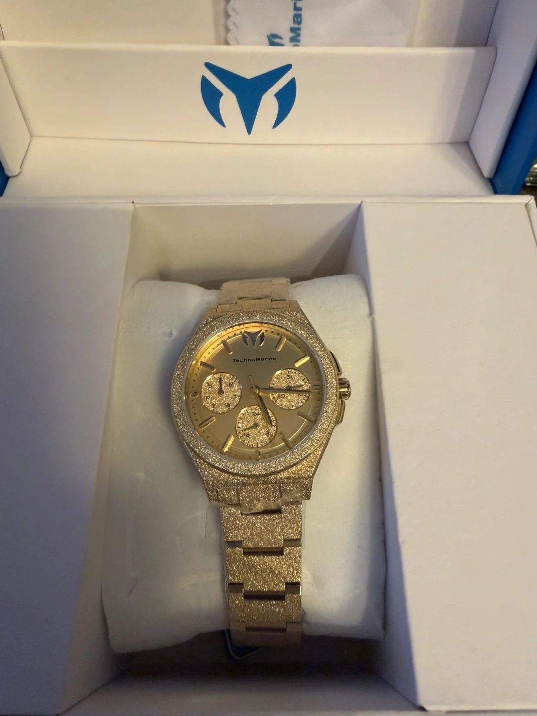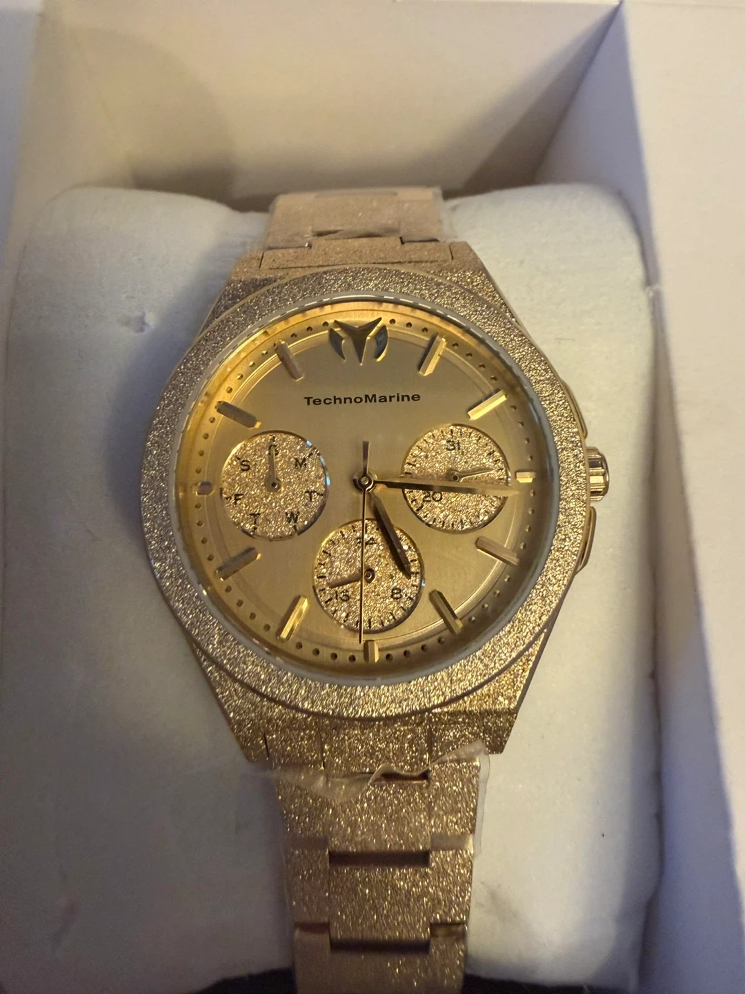 This TechnoMarine 34 mm watch features a striking gold finish and a chronograph dial. It's a stylish accessory with three subdials for added functionality. The watch comes in its original box, brand new . Very shiny , elegant . Free gift travel case either yellow or black so you can’t protect your watch when going away .