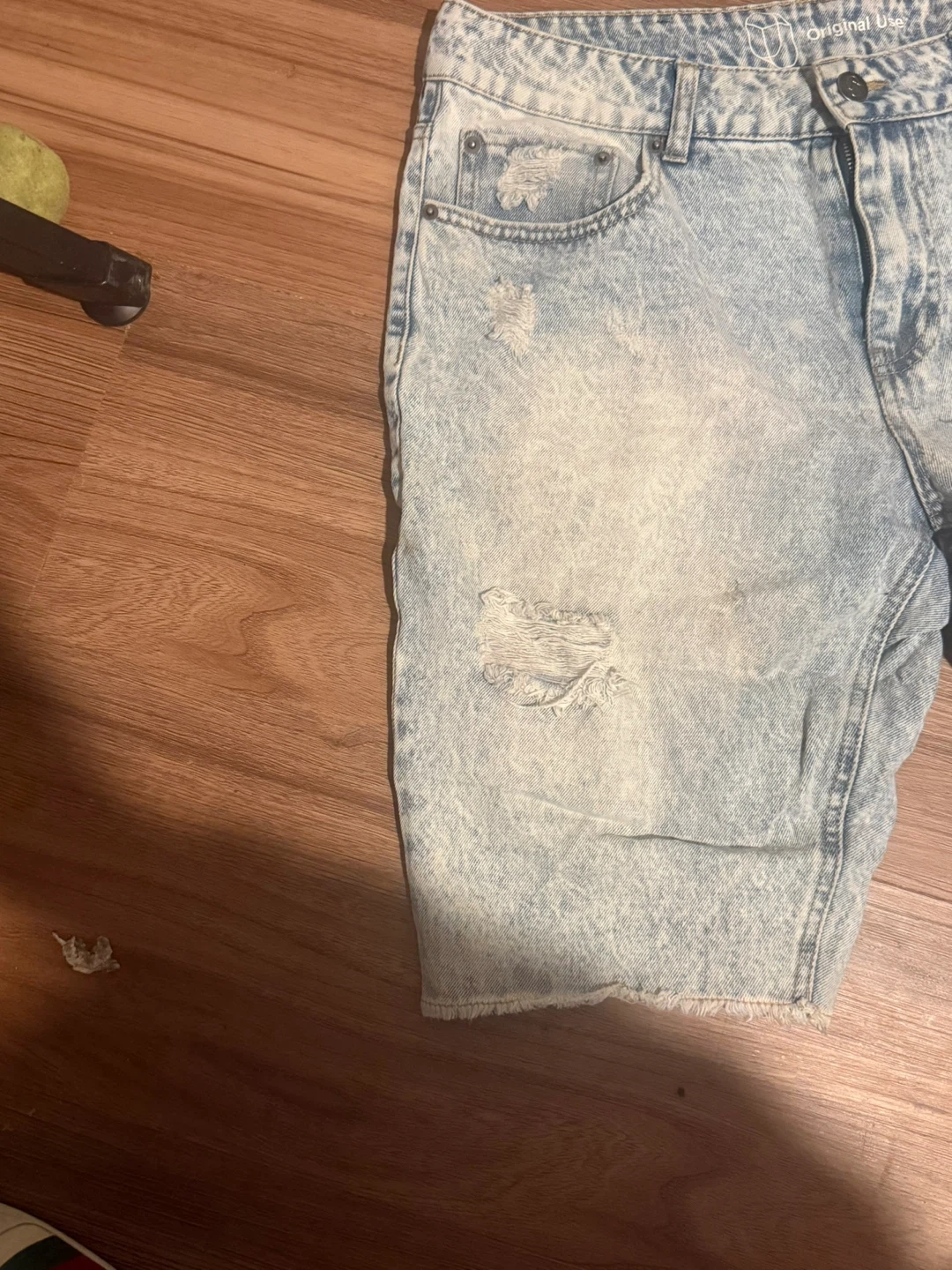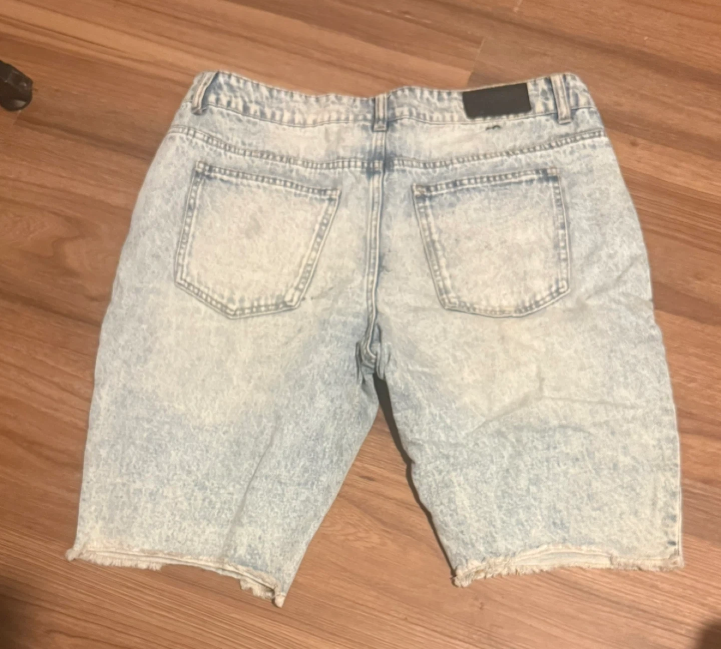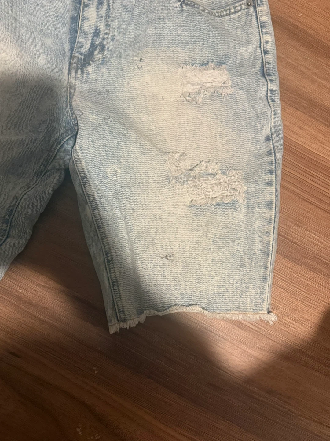 These acid wash denim shorts feature a distressed, ripped design with a raw hem. They have a classic five-pocket style and a button-fly closure. Perfect for casual wear during warmer weather.