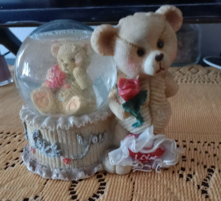Sweet teddy bear snow globe figurine. Features a smaller teddy bear inside the globe. Rose and "Love" accents. Collectible keepsake.