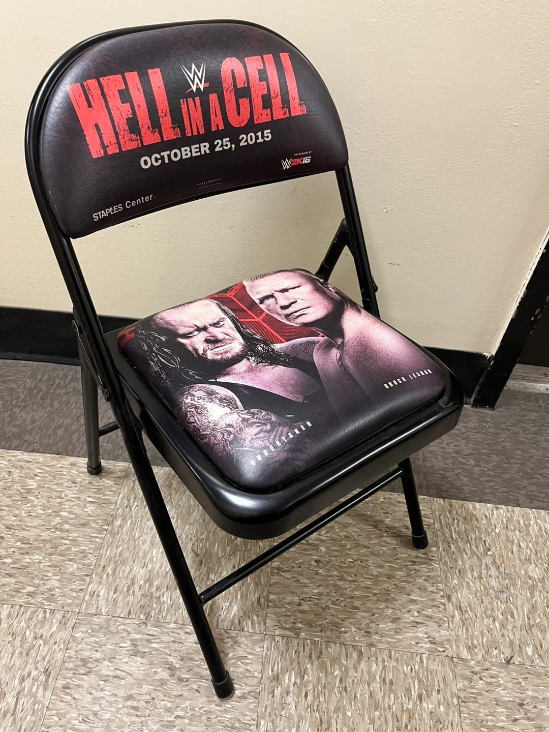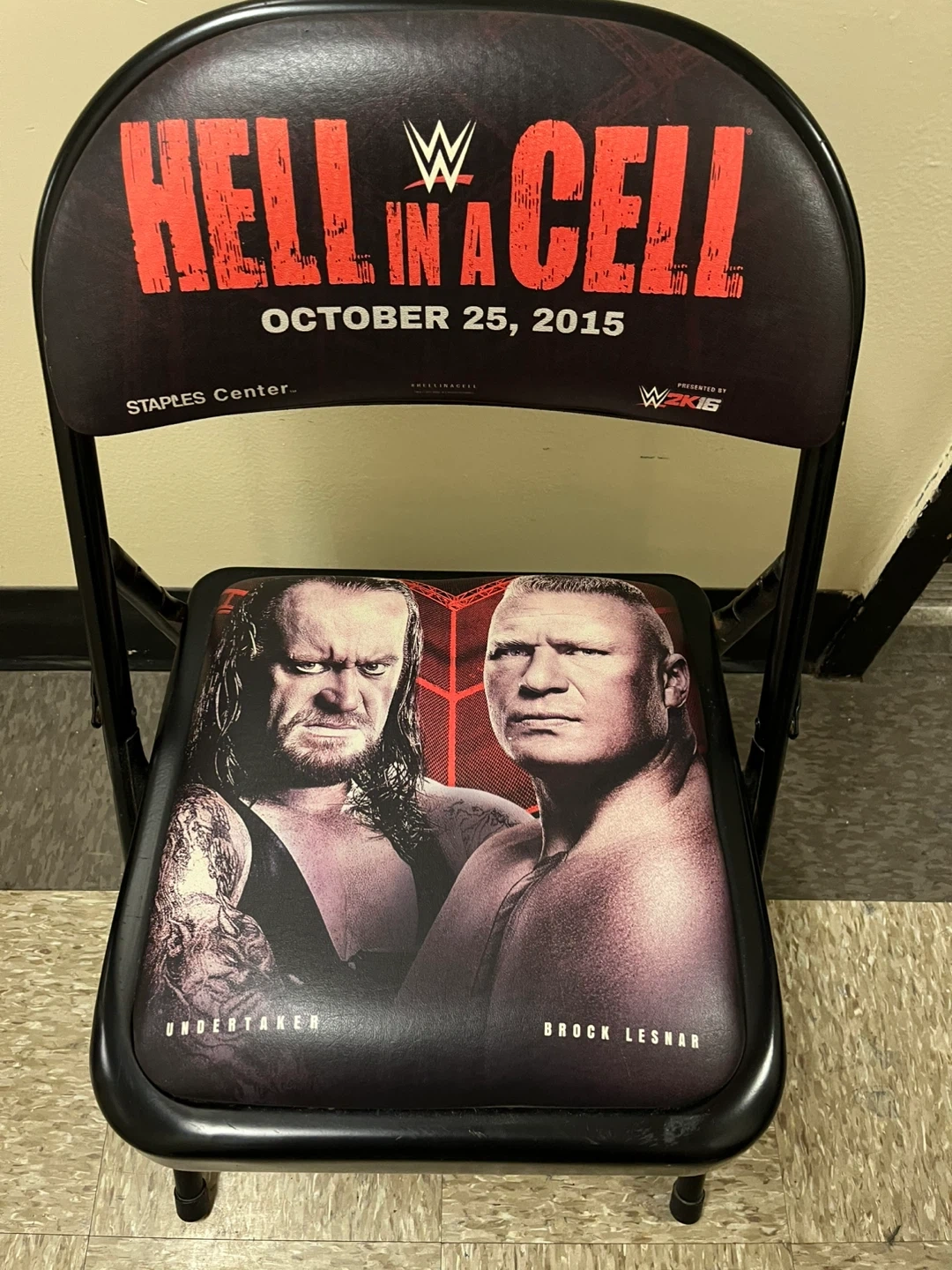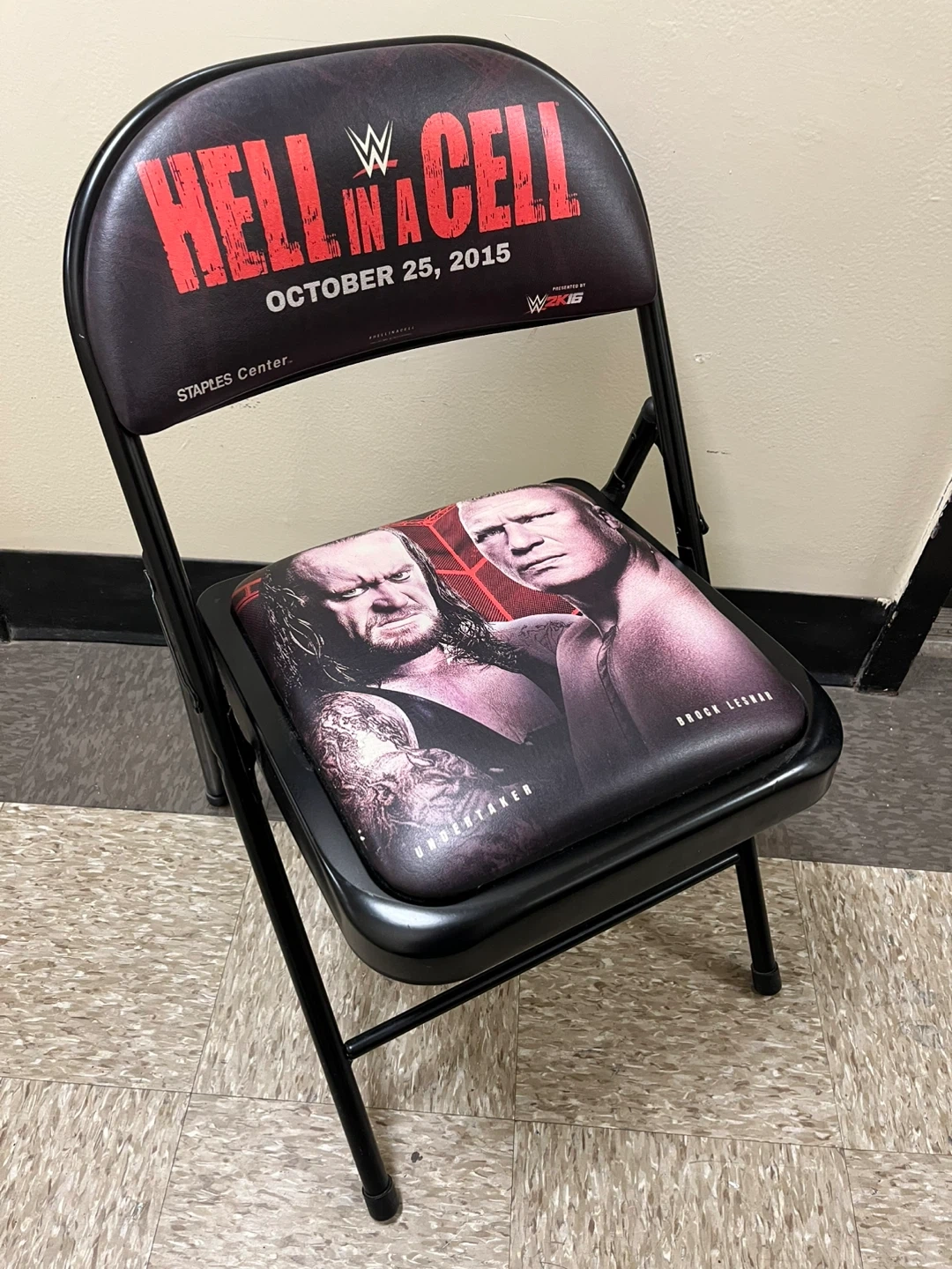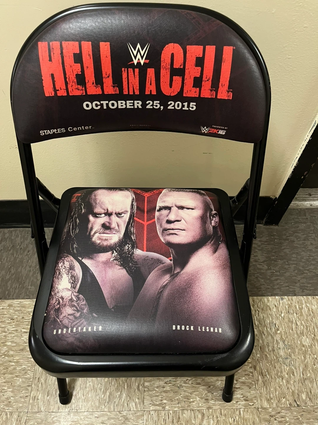 Folding chair commemorating WWE Hell in a Cell 2015 at Staples Center. Features Undertaker vs Brock Lesnar on the seat and "Hell in a Cell October 25, 2015" on the backrest. Metal frame with padded seat and back.