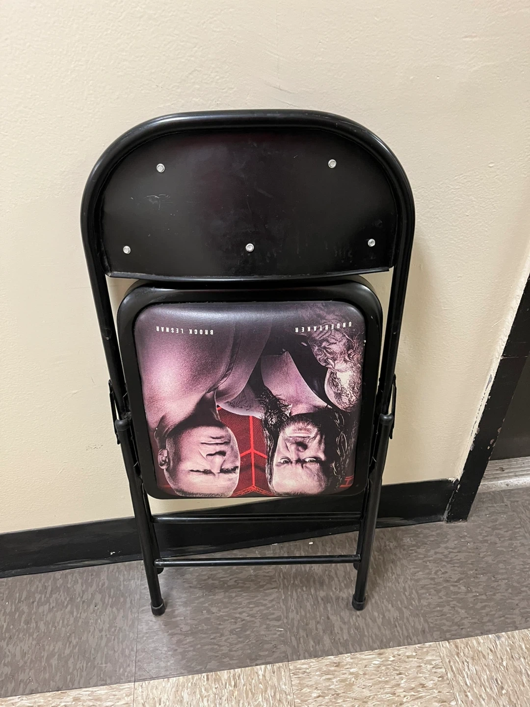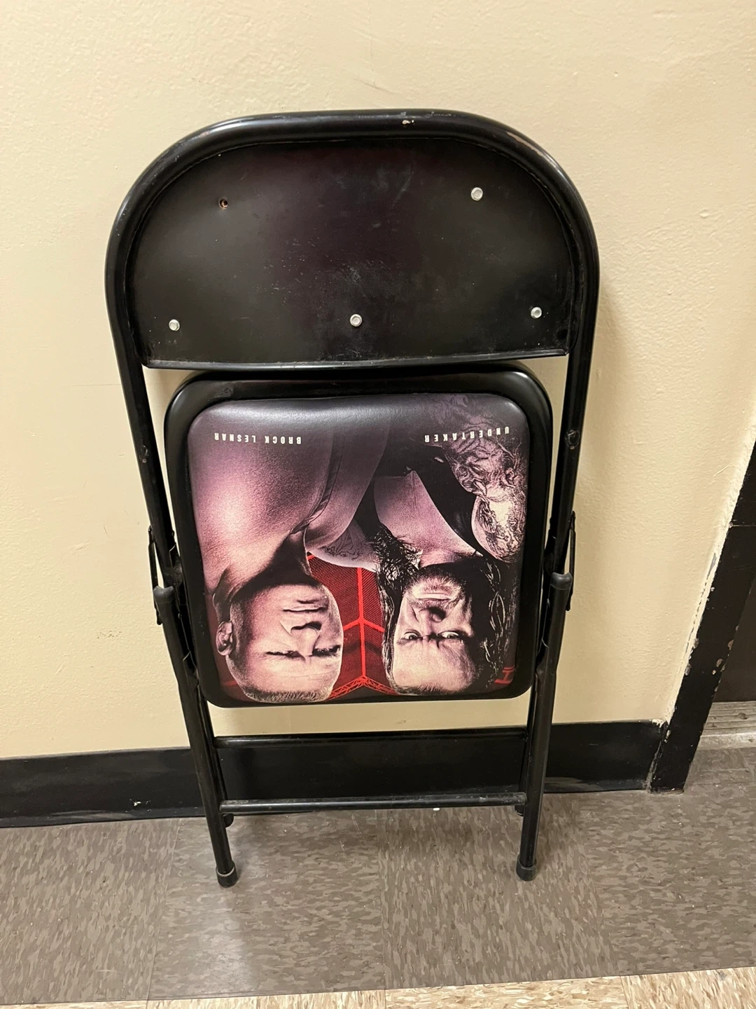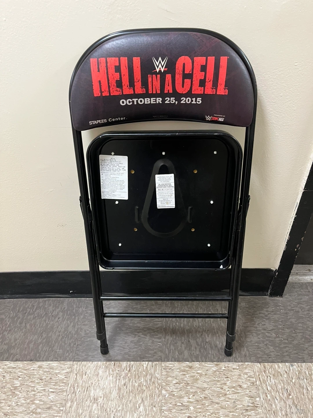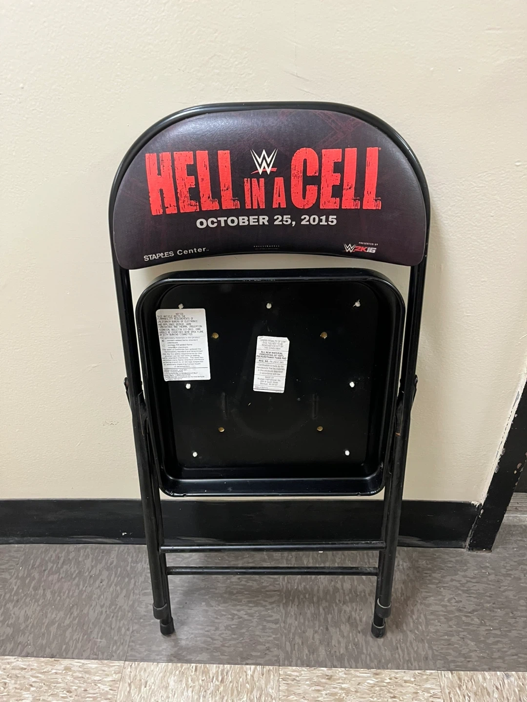Folding chair commemorating WWE Hell in a Cell 2015 at Staples Center. Features Undertaker vs Brock Lesnar on the seat and "Hell in a Cell October 25, 2015" on the backrest. Metal frame with padded seat and back.