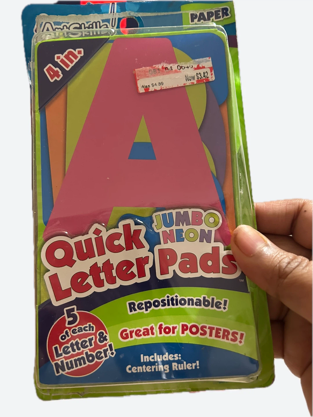 This set includes Jumbo Neon Quick Letter Pads. They're repositionable and great for posters! Includes a centering ruler.
