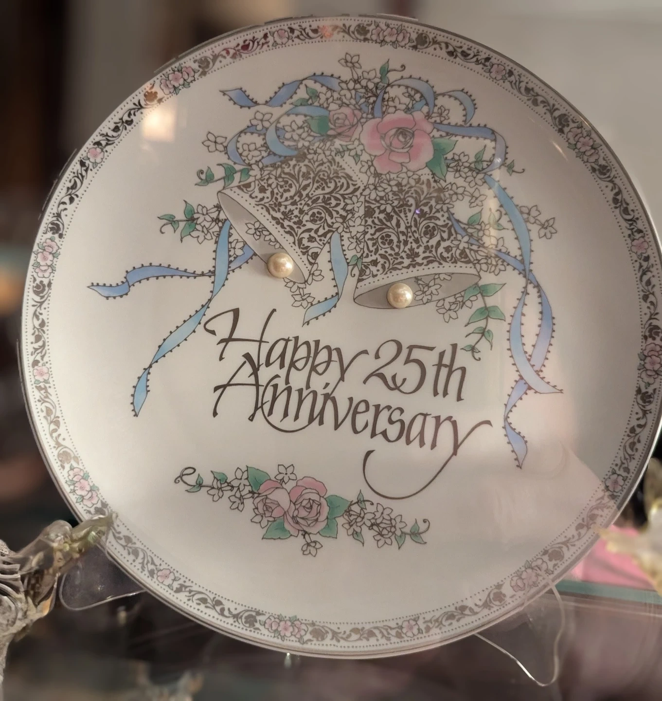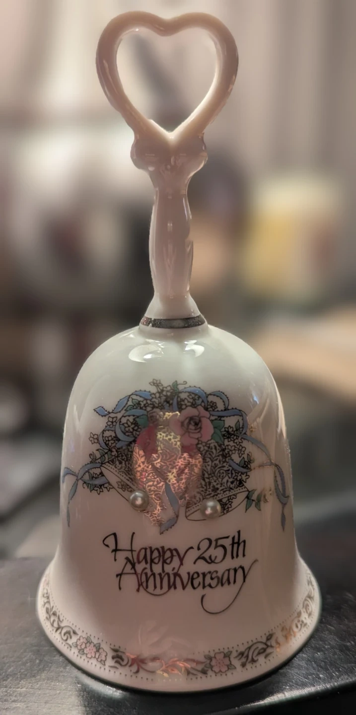 25th Anniversary Porcelain Plate and Bell. It features a design with bells, roses, and blue ribbons. They would be nice commemorative items