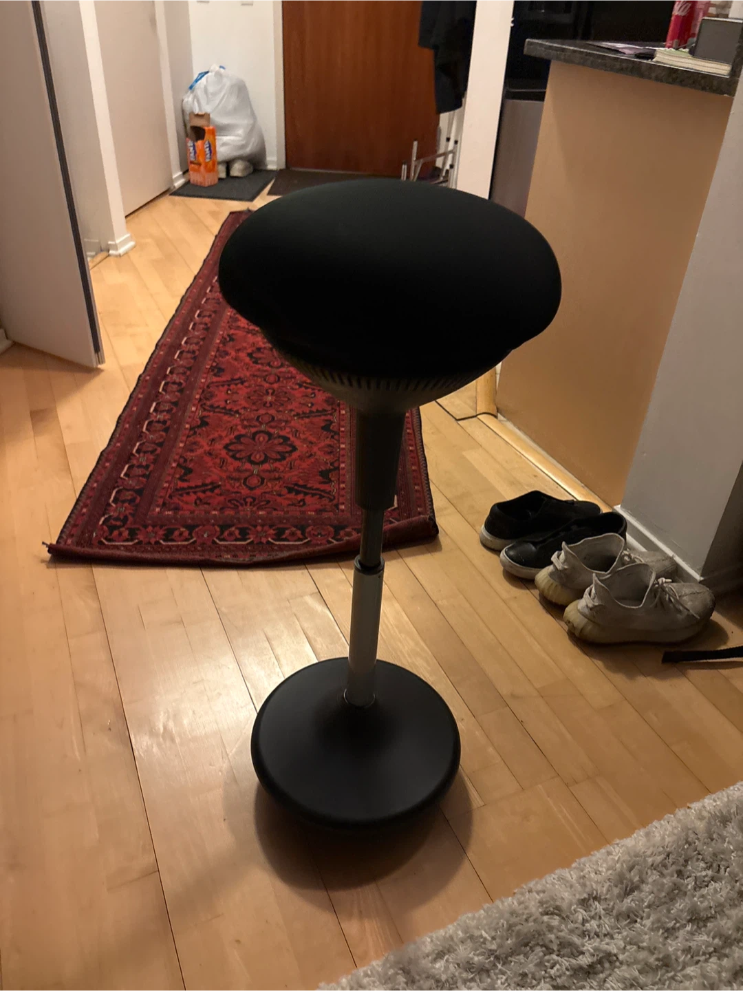 This black stool features an adjustable height mechanism for personalized comfort. Its sturdy base ensures stability during use. It's a versatile seating option for various spaces.