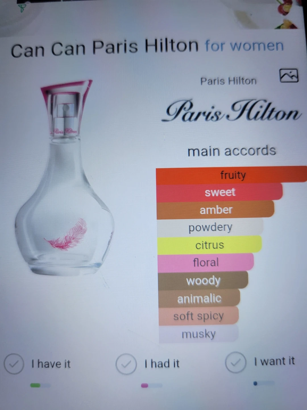 Paris Hilton "I Do... I Do..." fragrance for women. Eau de Parfum, 3.3 fluid ounces. It's a fruity, sweet, and floral scent with amber and citrus notes.