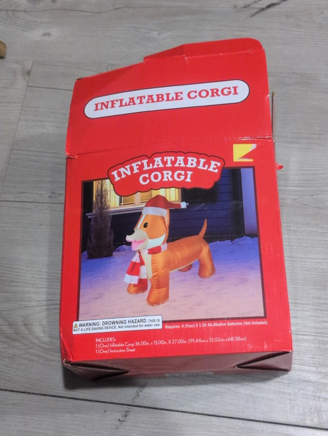This inflatable corgi decoration measures 36" x 13" x 27". It includes an instruction sheet. Batteries are not included and it requires four AA batteries.
