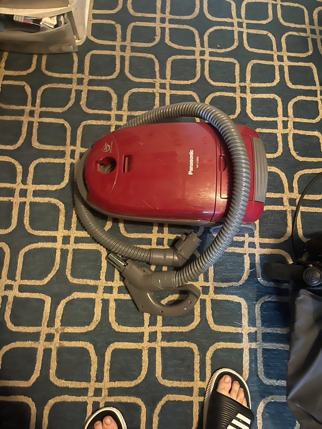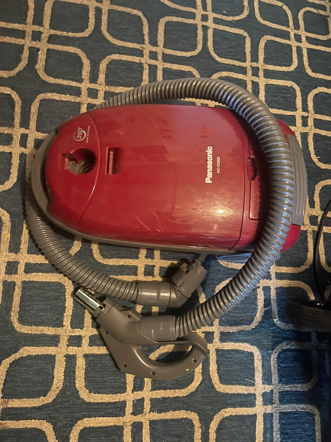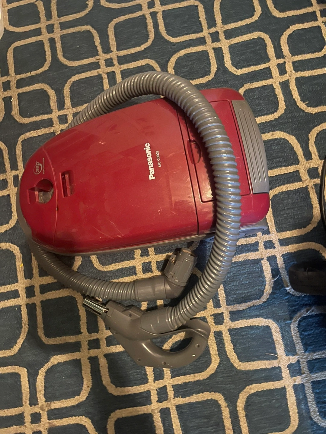 Vaccum The image shows a Panasonic MC-CG902 Canister Vacuum Cleaner. It features a powerful 12-amp dual-motor system for strong cleaning performance. The vacuum includes a HEPA exhaust filter to capture allergens and small particles. It comes with various on-board attachments like an upholstery tool, floor brush, dusting brush, and crevice tool.