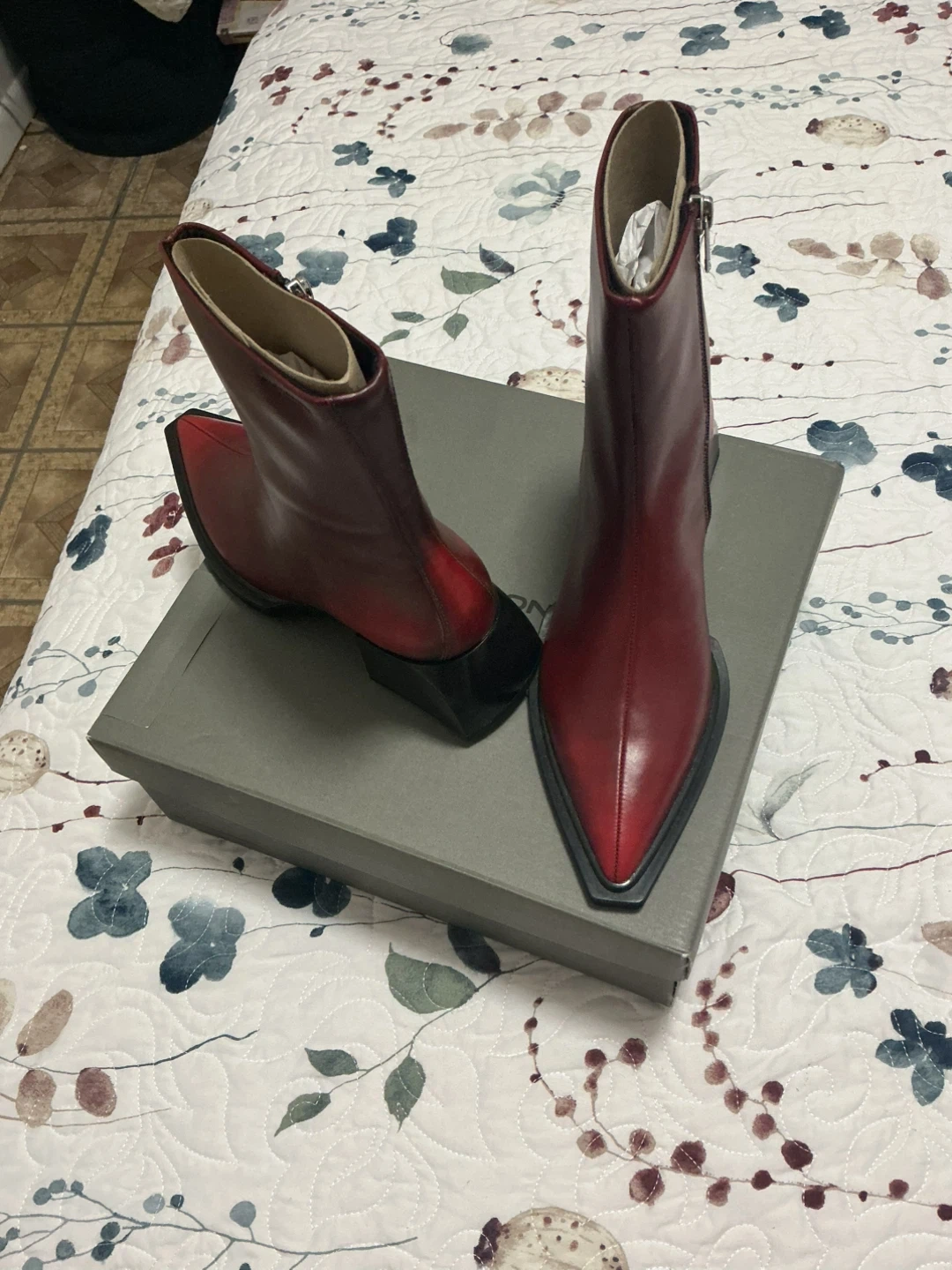 60Selling a pair of stylish red leather ankle boots! They have a sleek, pointed toe and a unique color gradient. These boots are in great condition and come with their original box
