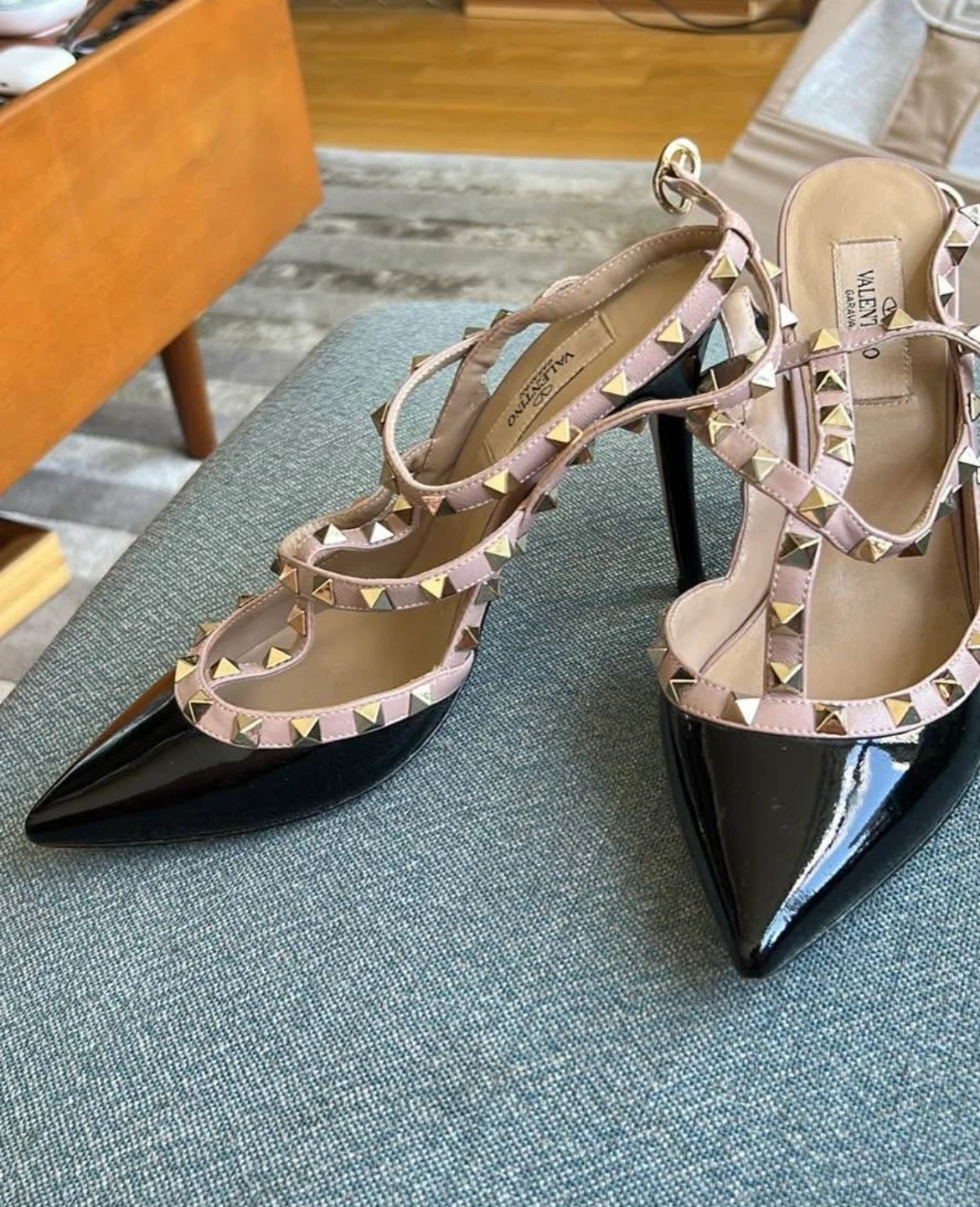 707Selling a pair of Valentino Garavani Rockstud heels. They are a light pink and black color with gold studs. There are some signs of wear on the soles, but they are still in good condition!