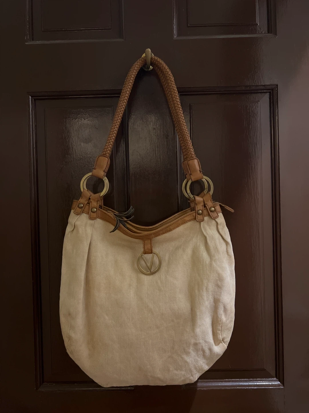 15Selling a a vintage Valentino Orlandi hobo bag in beige canvas. It's a stylish and functional bag with braided handles and leather trim. Perfect for everyday use!