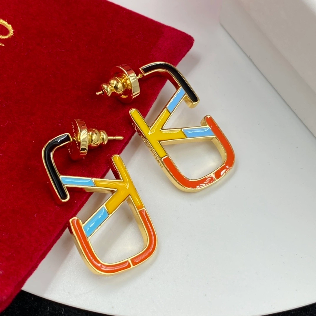 These are a pair of Valentino earrings featuring the VLogo design. They have a gold-tone finish with colorful enamel accents in black, yellow, red, and blue. They're brand new and ready to add a pop of color to your outfit! Sold with box and dust bag.
