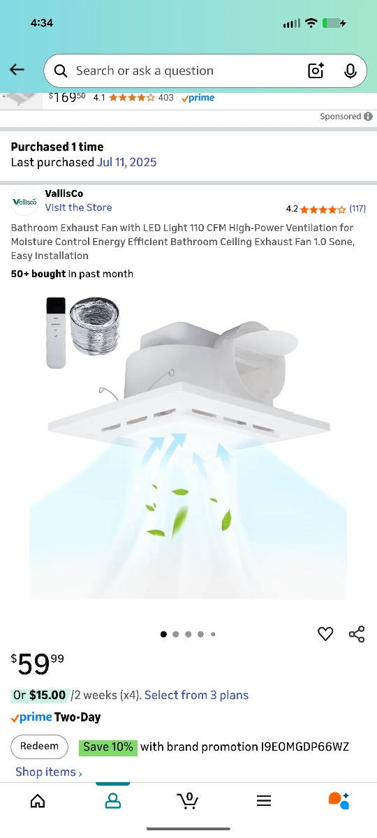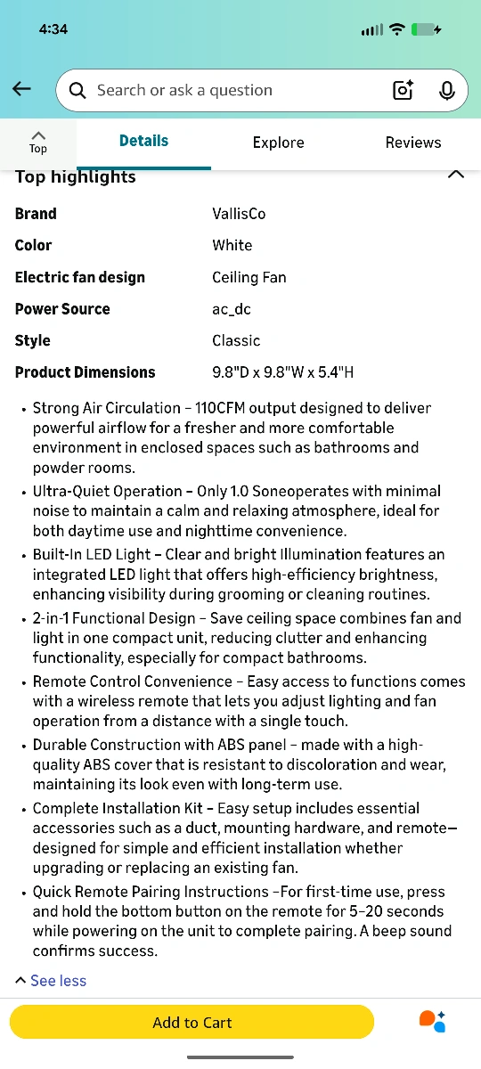 I'm selling a VallisCo bathroom exhaust fan with an LED light. It's white and designed for moisture control in bathrooms. It features strong air circulation at 110CFM and operates quietly at only 1.0 sone. The built-in LED light is clear and bright, perfect for grooming or cleaning. It also comes with a remote control for easy operation. Originally bought for $59.99
