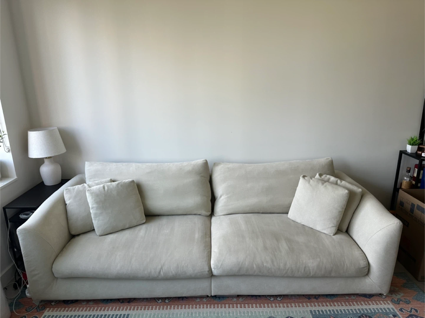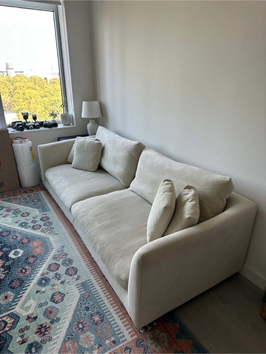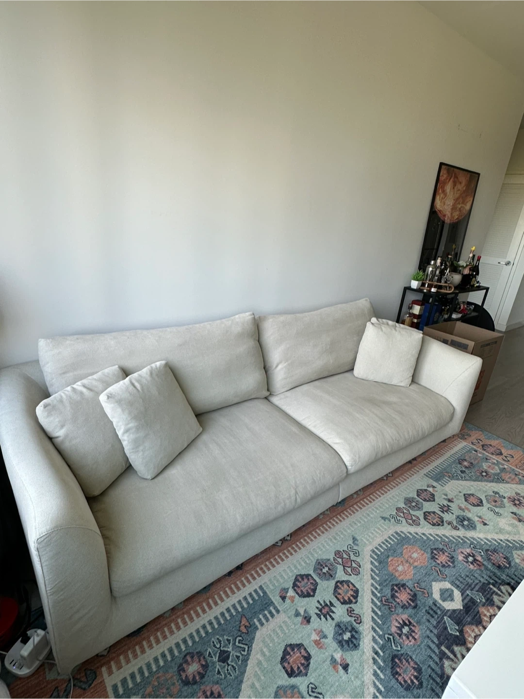 60Selling a very comfortable cream-colored sofa. It's in really good condition and ready for a new home! Dimensions: 103"W x 39"D x 32"H Sells brand new for $1.5K https://valyoufurniture.com/products/feathers-sofa?variant=46559356092636 Pick up in downtown Brooklyn / Fort Greene