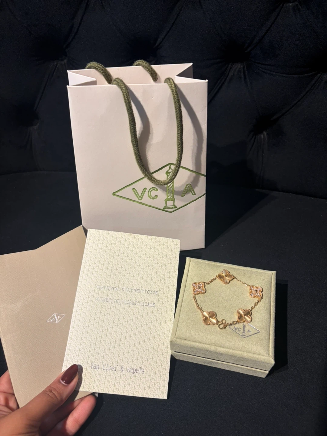 65Selling a beautiful Van Cleef & Arpels Vintage Alhambra bracelet with 5 motifs. The bracelet comes with its original box and certificate of authenticity. It weighs approximately 14 grams. This bracelet is a timeless piece!