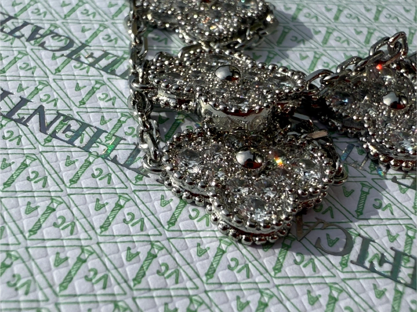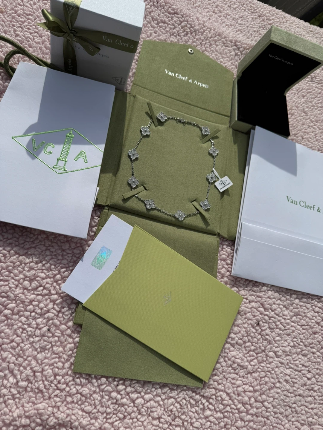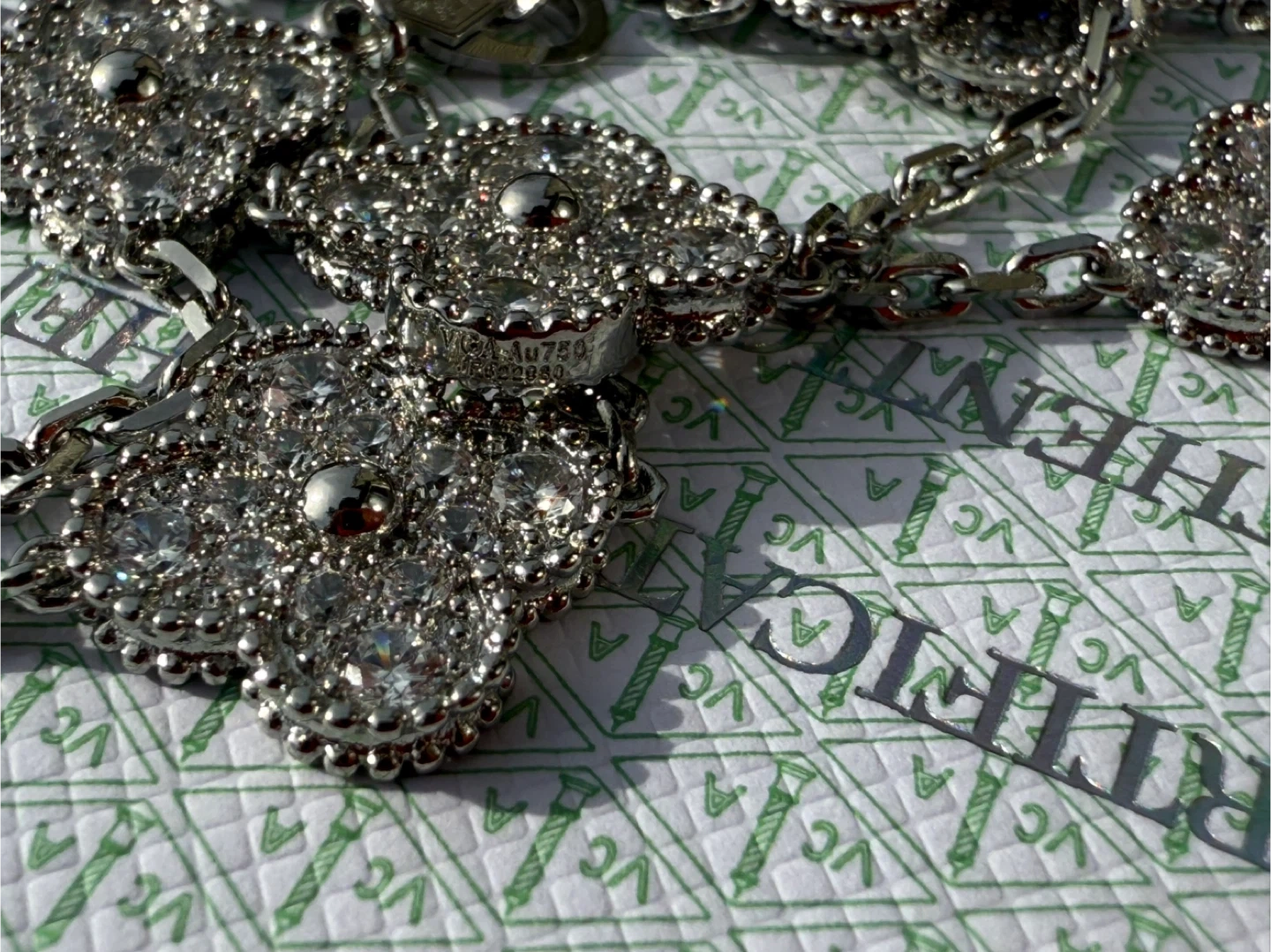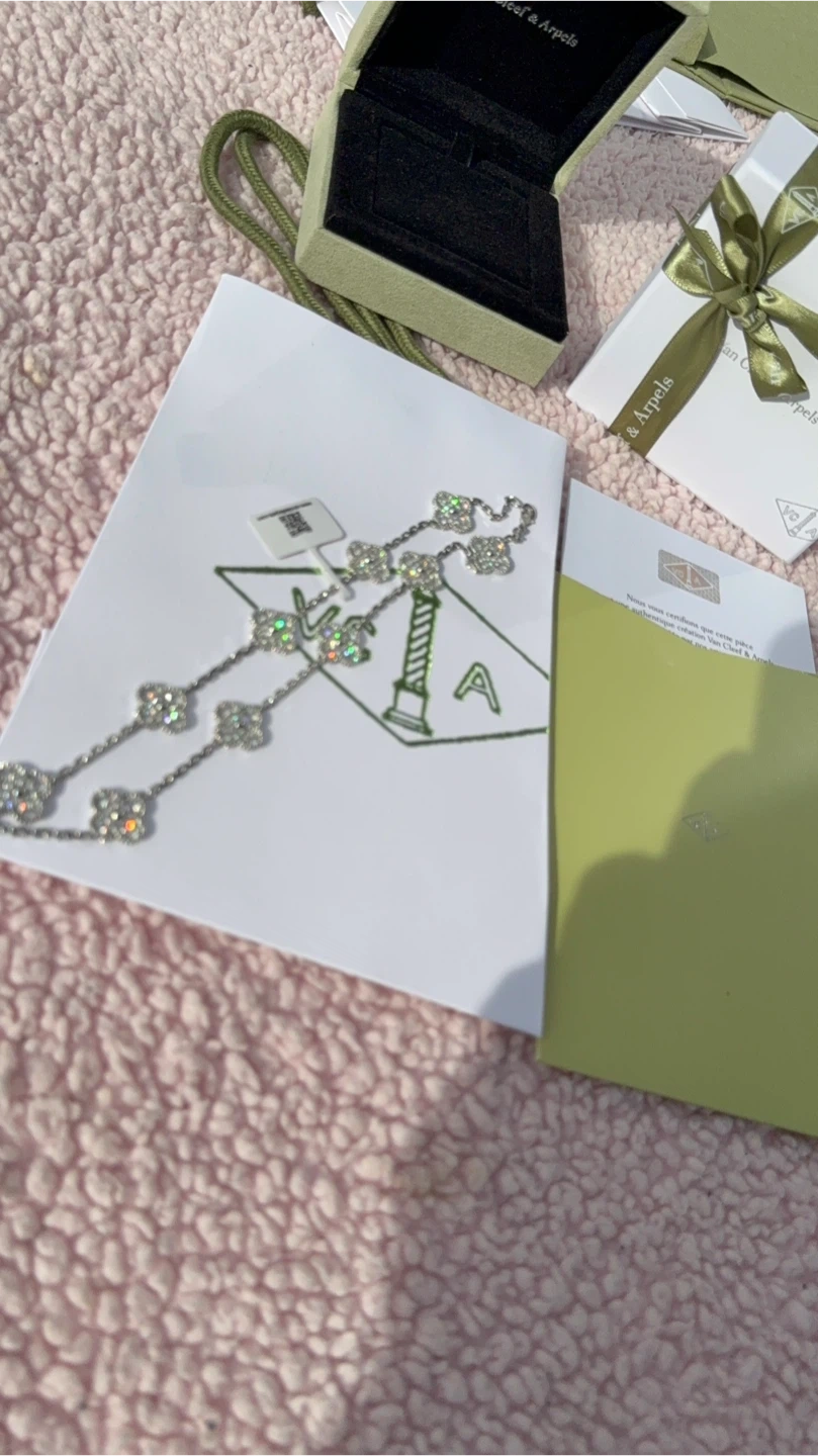 15โจ Van Cleef 10 Motif Diamond Necklace ๐ luxury statement piece crafted with brilliant diamonds set in 18k gold Vermeil. ๐ฆ Includes full packaging: VCA box, bow tie, shopping bag & authenticity papers. ๐ Highly sought after & rare, perfect for collectors or for stacking ๐ซ Timeless design that adds instant elegance & sophistication to any look.