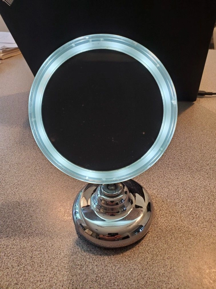 Magnified and lighted, brand new minus the box. Features: Lighted, Magnifying, Portable Mirror Type: Standing mirror