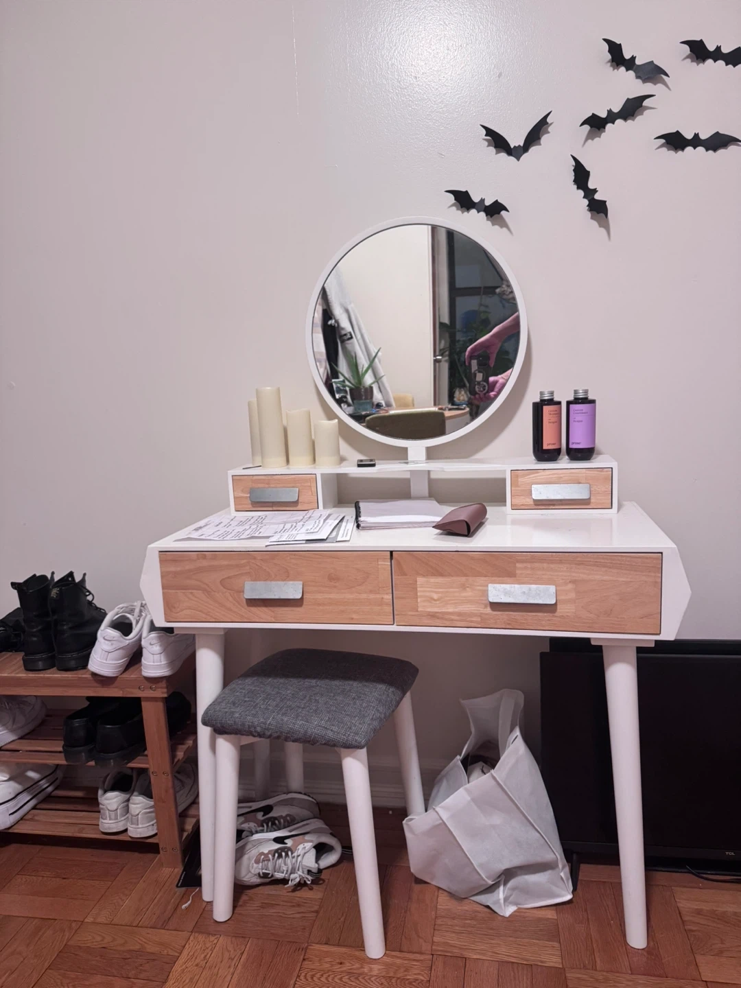 60Selling a vanity table with a round mirror and matching stool. It features a white frame with light wood drawers and a gray cushioned stool. Perfect for adding a touch of elegance to your bedroom or dressing area