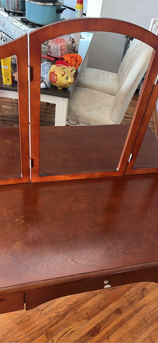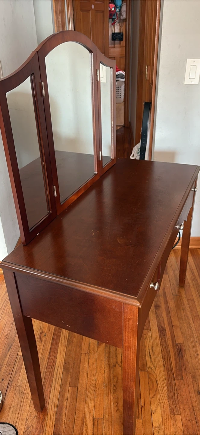 Here's a vanity table with a tri-fold mirror. It's a nice piece for a bedroom or dressing area. The vanity has a rich, dark wood finish and a classic design. It has a drawer for storage and the tri-fold mirror offers different viewing angles