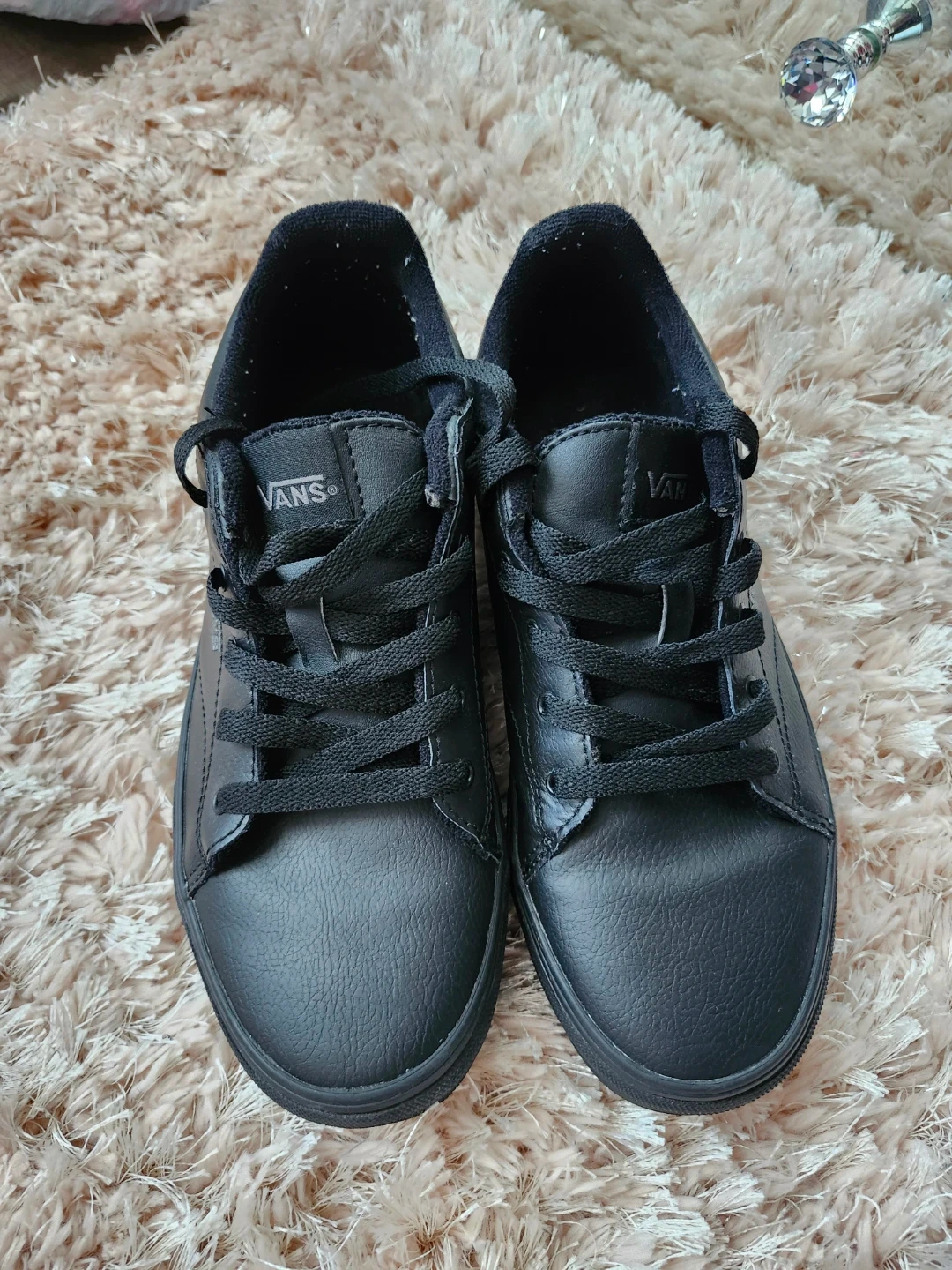 10Selling a pair of Vans black leather sneakers in youth size 6. They are in great condition and ready for a new home! The sneakers feature a classic design with the Vans logo. Perfect for everyday wear!