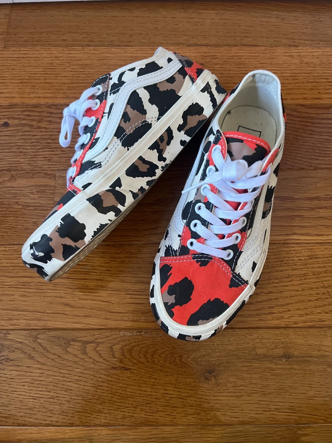 Cute Vans Old Skool shoes with a fun leopard print design! They feature a mix of white, red, brown, and black spots. Perfect for adding a pop to any outfit. Only worn 3 or 4 times and in near perfect condition!