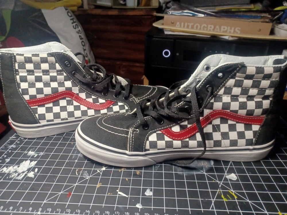 Black and white checkered Vans with red side stripe. High top with zipper closure. Cleaned and sanitized, slight wear of logo tabs on both shoes.