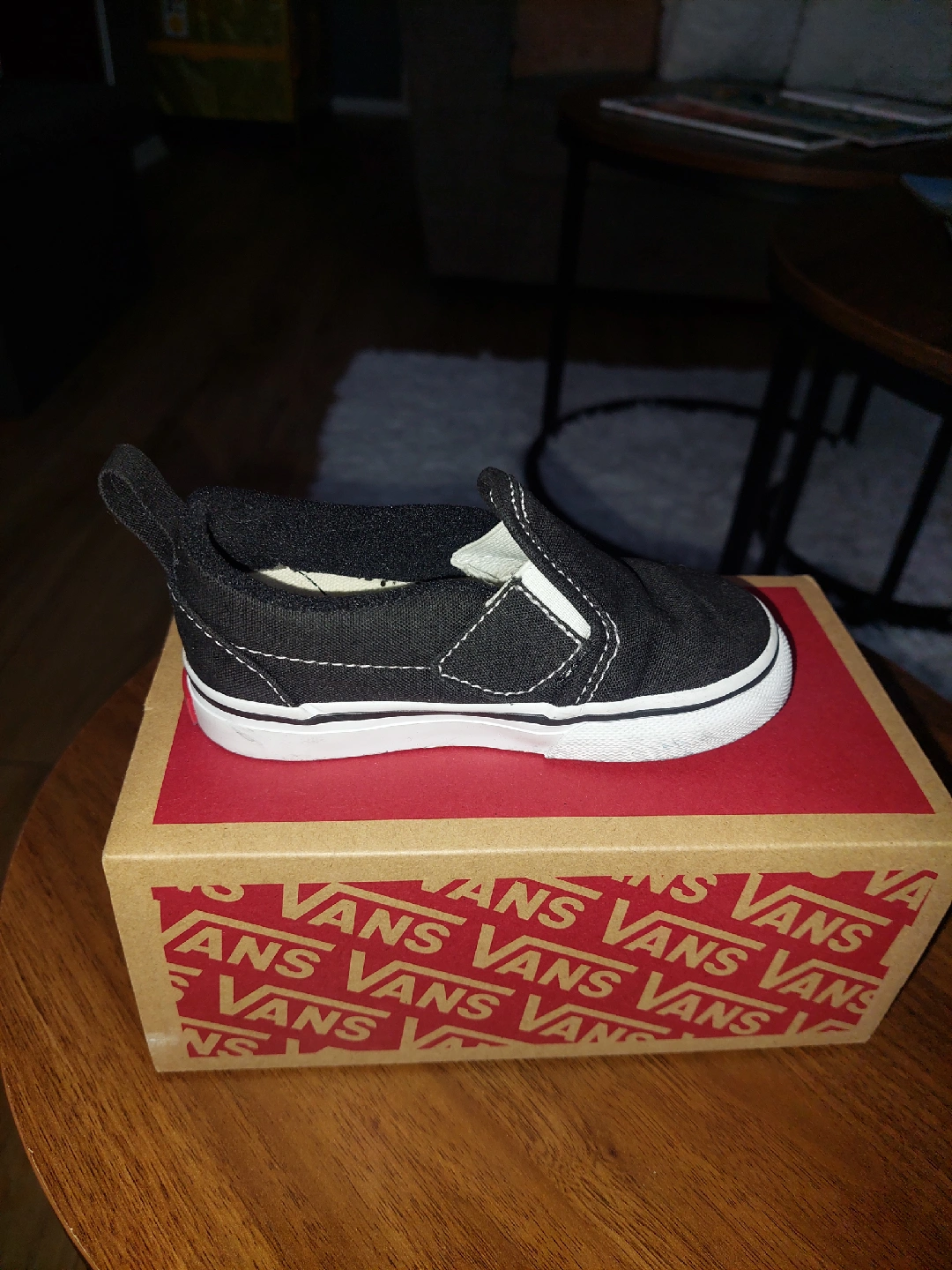 Selling a pair of Vans kids slip-on shoes in black. They come with the original box!