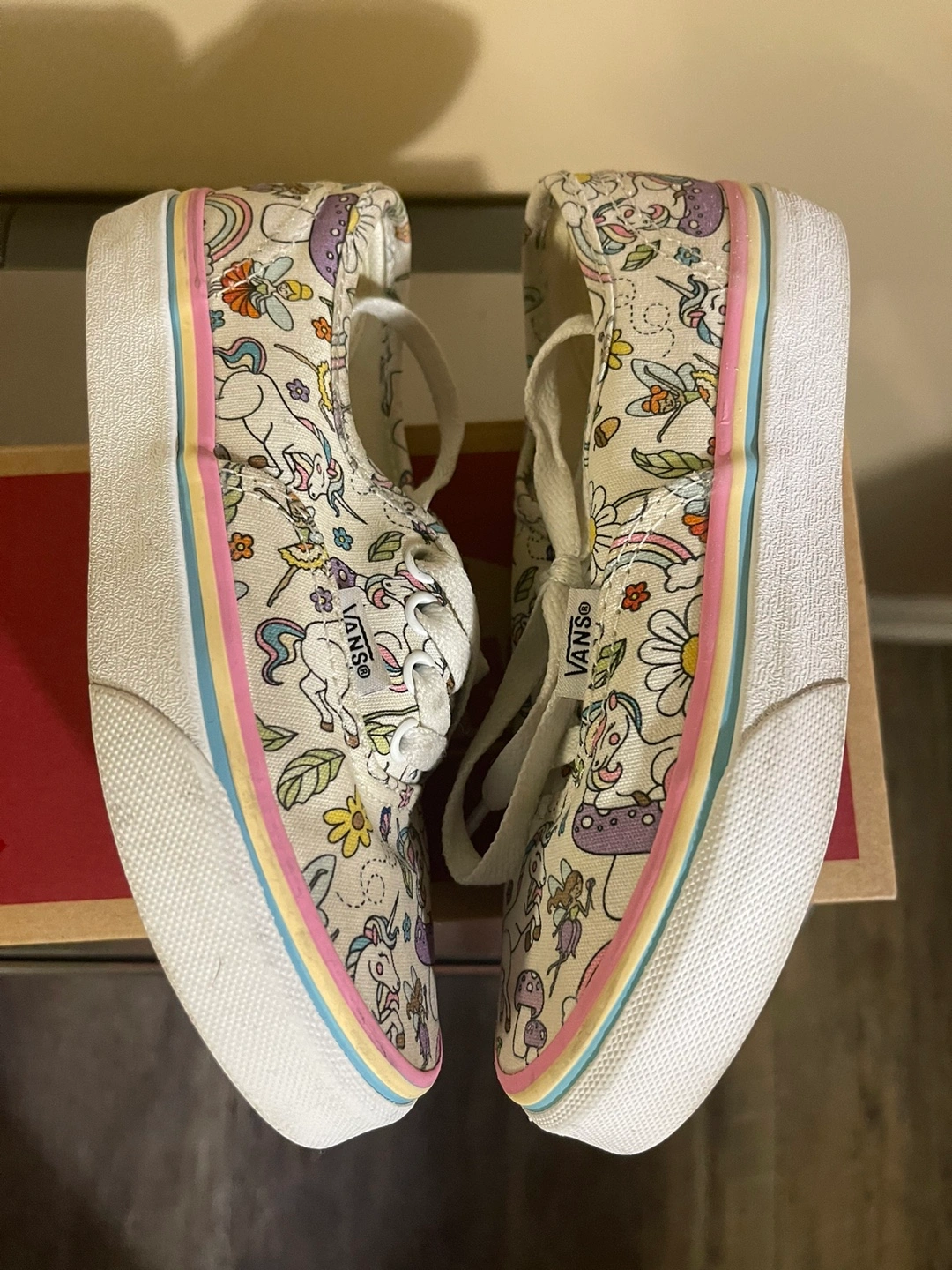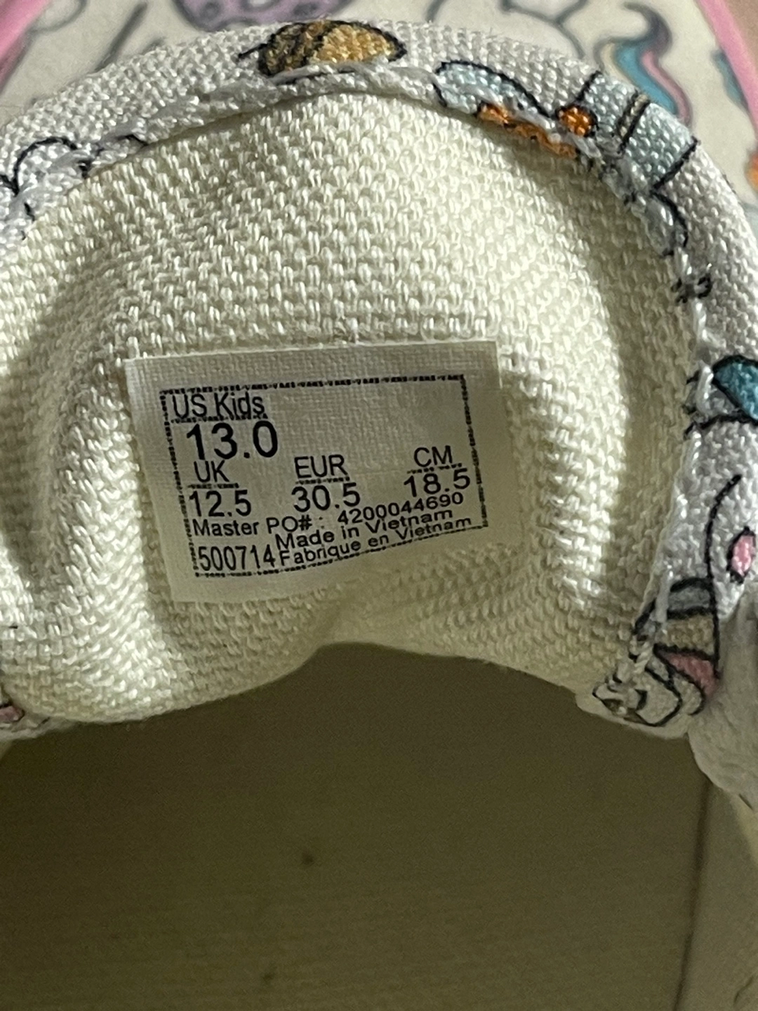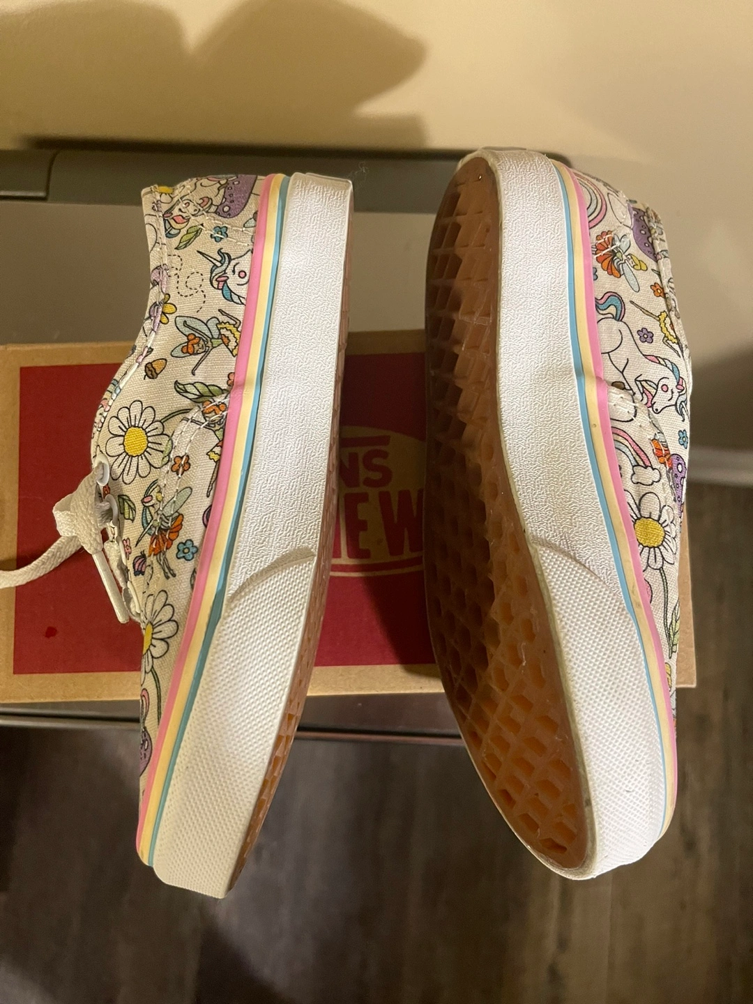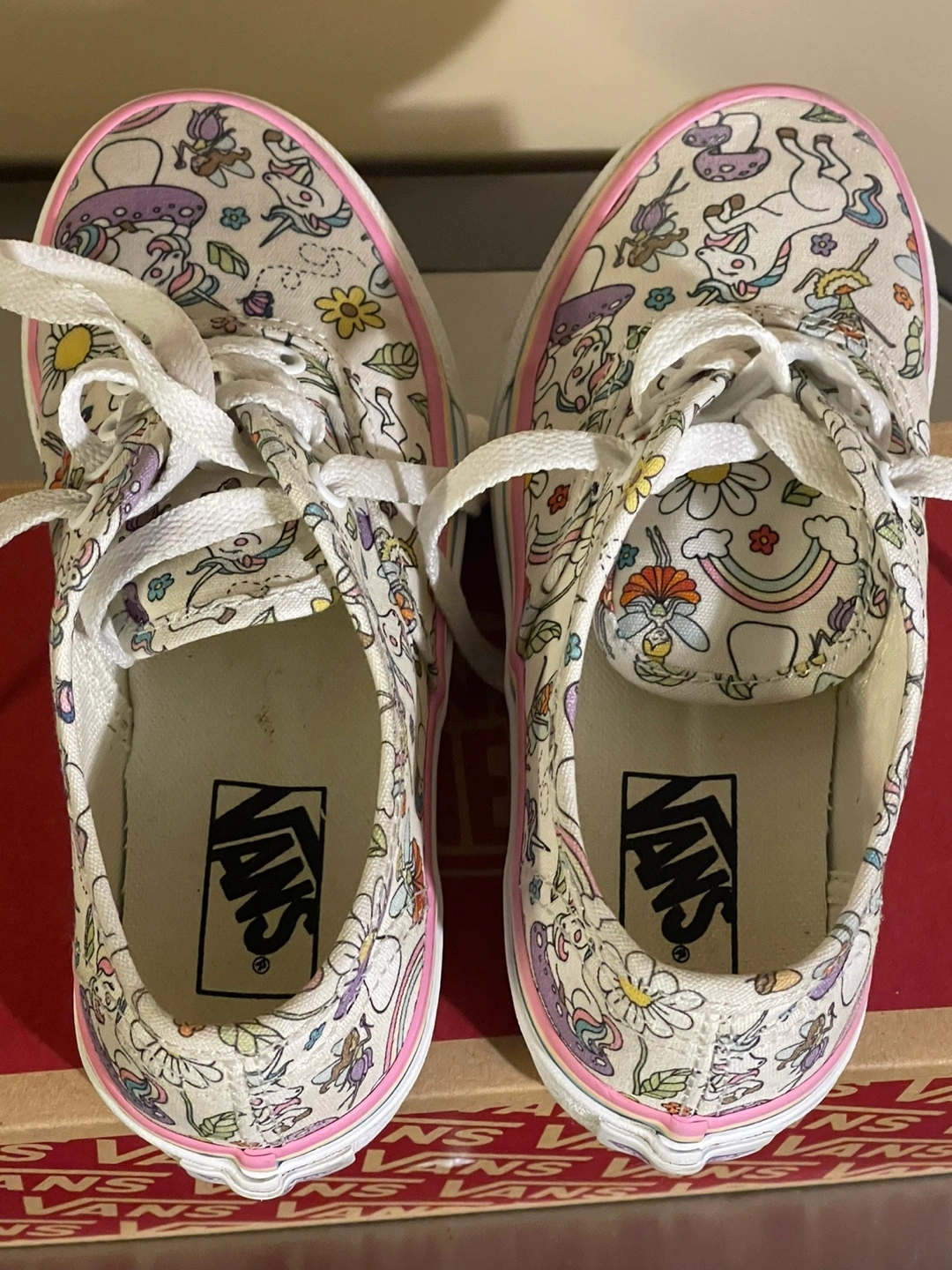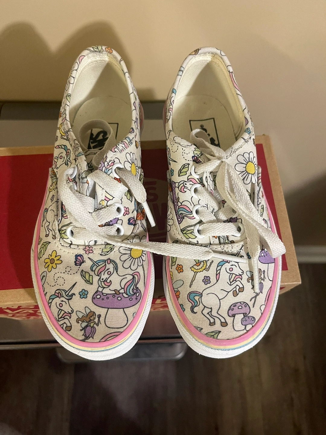 15Vans Authentic Donut Unicorn Skate Shoe - Little Kid - Multicolor $20 Kids Vans sneakers with unicorn and flower pattern. Pink, blue, and yellow trim around the edges. White laces.