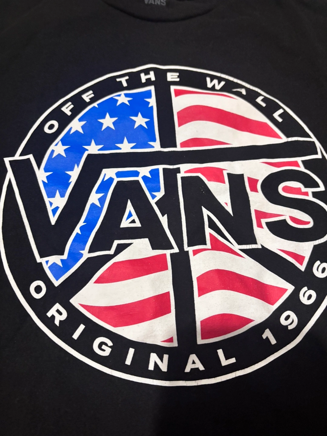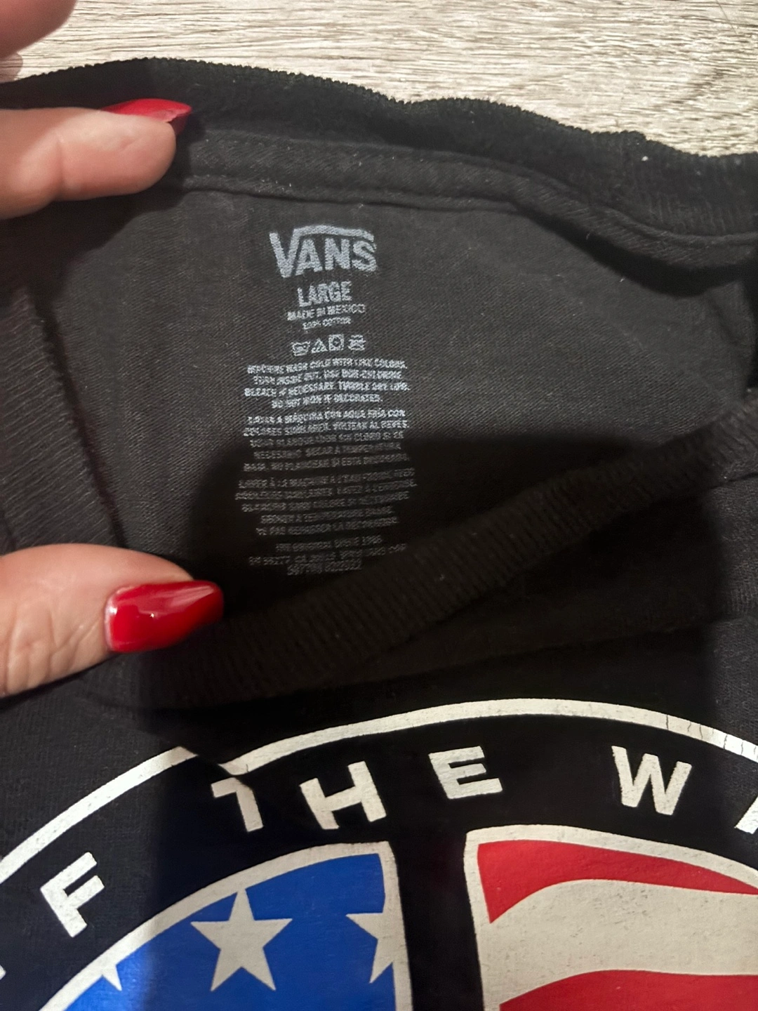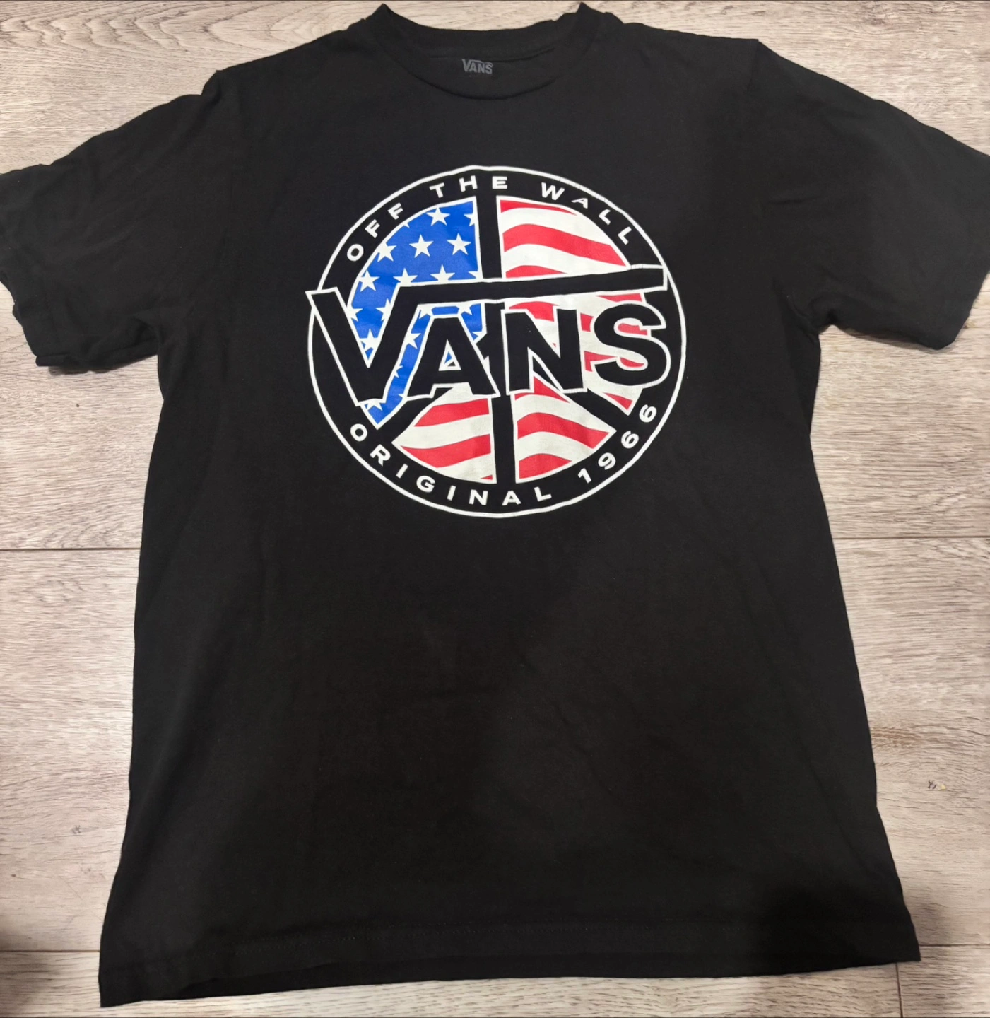 47Classic Vans “Off the Wall” Original 1966 T-shirt with bold USA flag logo — a timeless skatewear piece! Made from 100% cotton, soft and comfy, and easy to style with jeans or shorts. Tag says Large, but it is youth size fits closer to an Adult Small or Youth Large (please check measurements below). Size 10-12 I would say Condition: Hardly worn . Perfect condition Measurements (approx.): • Chest (pit to pit): 17 in • Length (collar to hem): 22 inches Ships fast & packaged with care from a smoke-free home. Perfect for skatewear lovers, casual outfits, or collectors of classic Vans gear.
