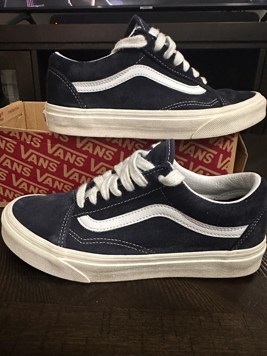 65Vans Old Skool sneakers in a stylish navy blue suede! These are a men's US size 5.5. The shoes are in good condition and come with the original box