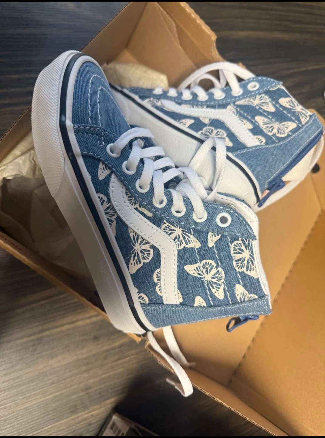 10These are a pair of new Vans Sk8-Hi Zip shoes for toddlers! They feature a cool denim material with a butterfly pattern. The shoes also have a zipper on the back for easy on and off. They come with the original box.Size 11 toddler