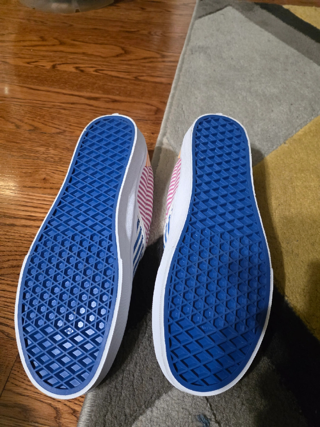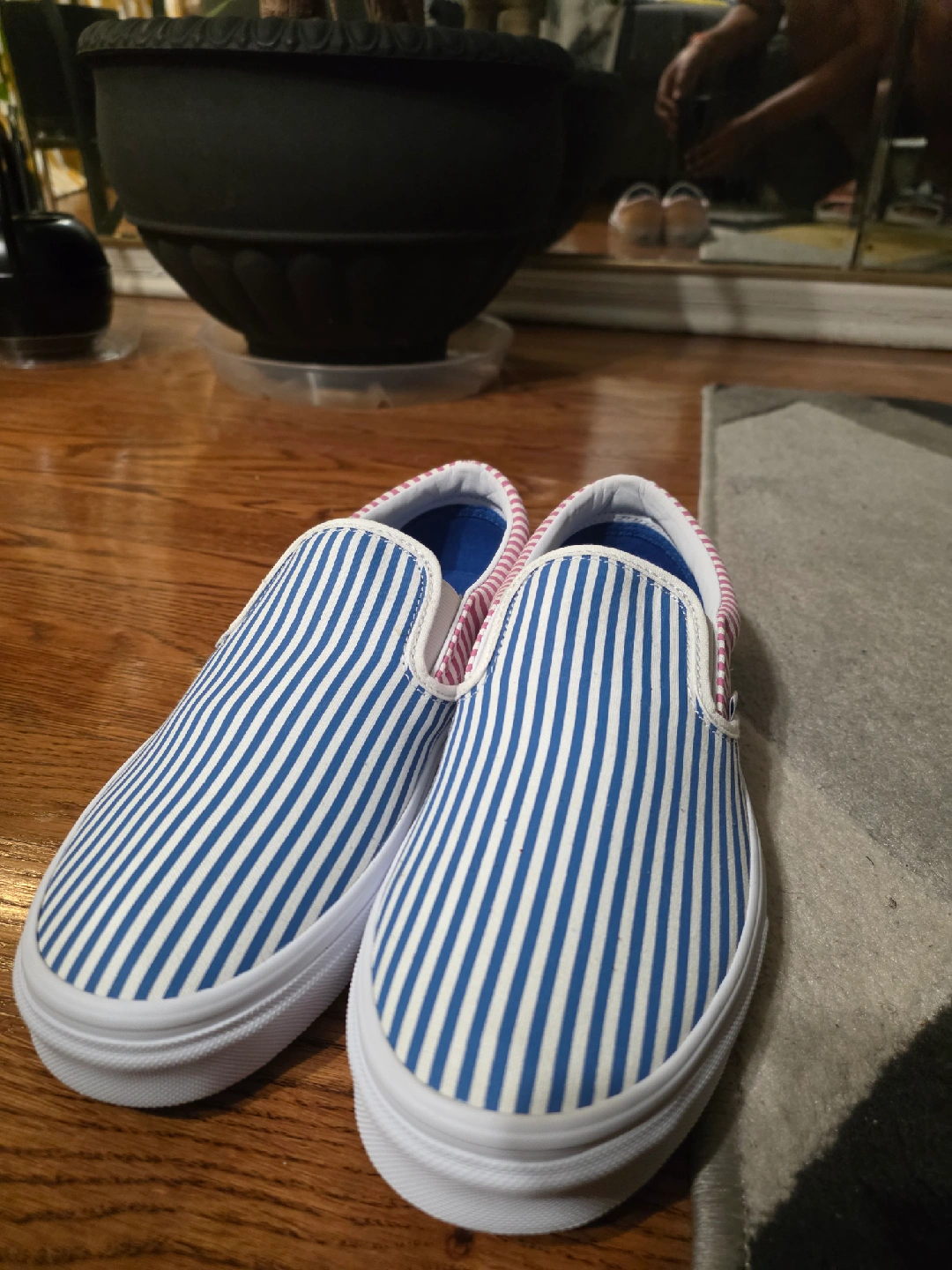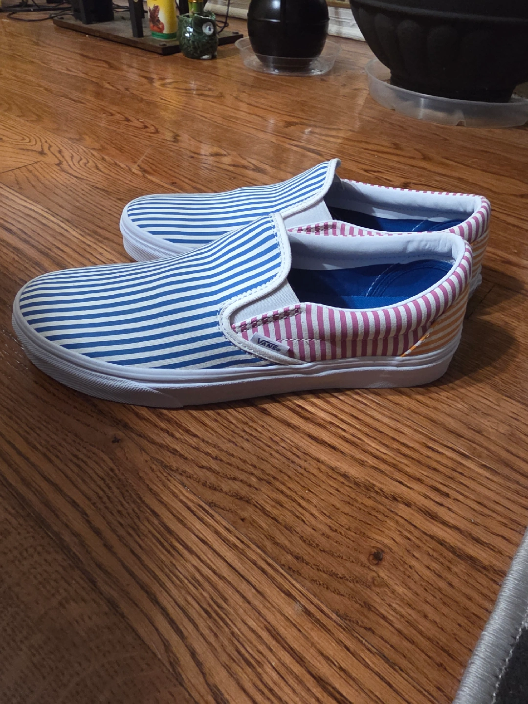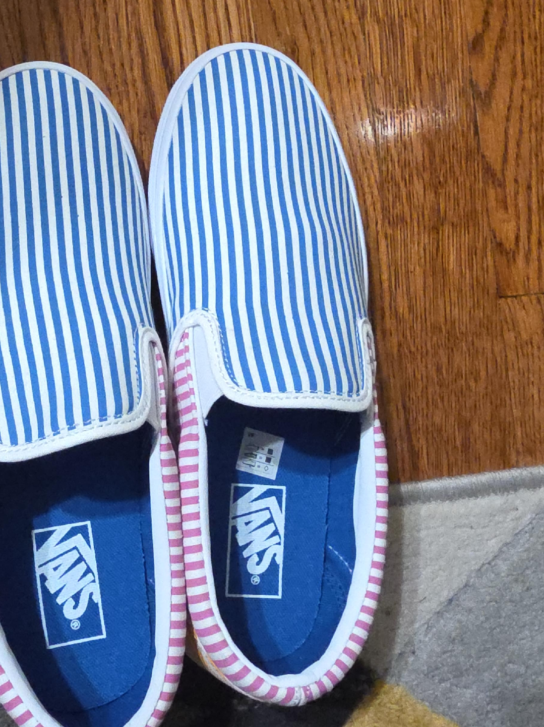 Selling a pair of Vans slip-on shoes with a blue and white striped pattern! These are in great condition and ready for a new home. Perfect for casual wear and adding a pop of color to your outfit