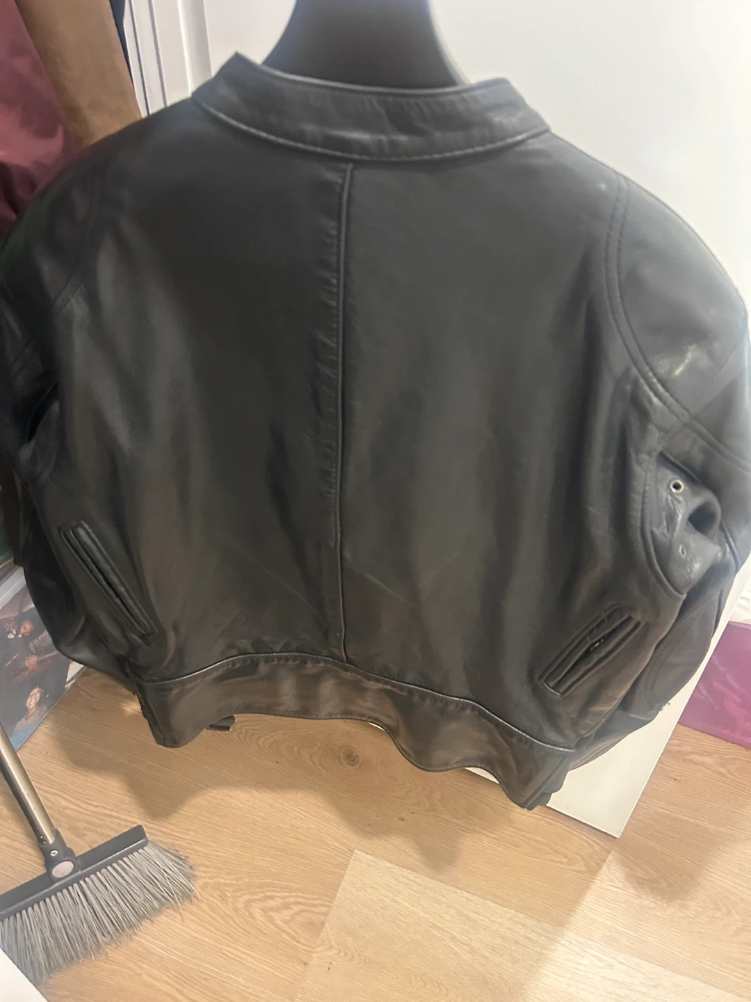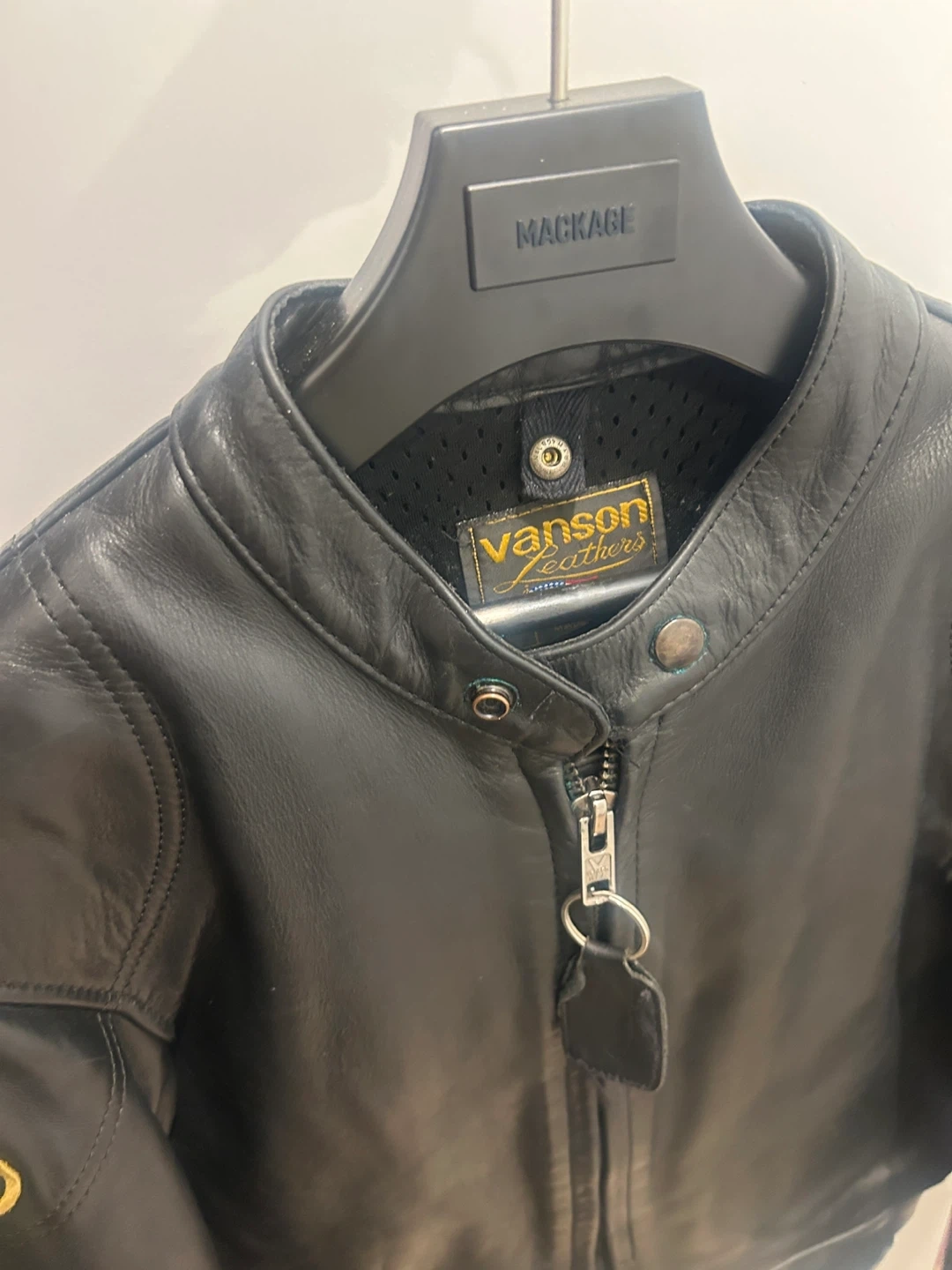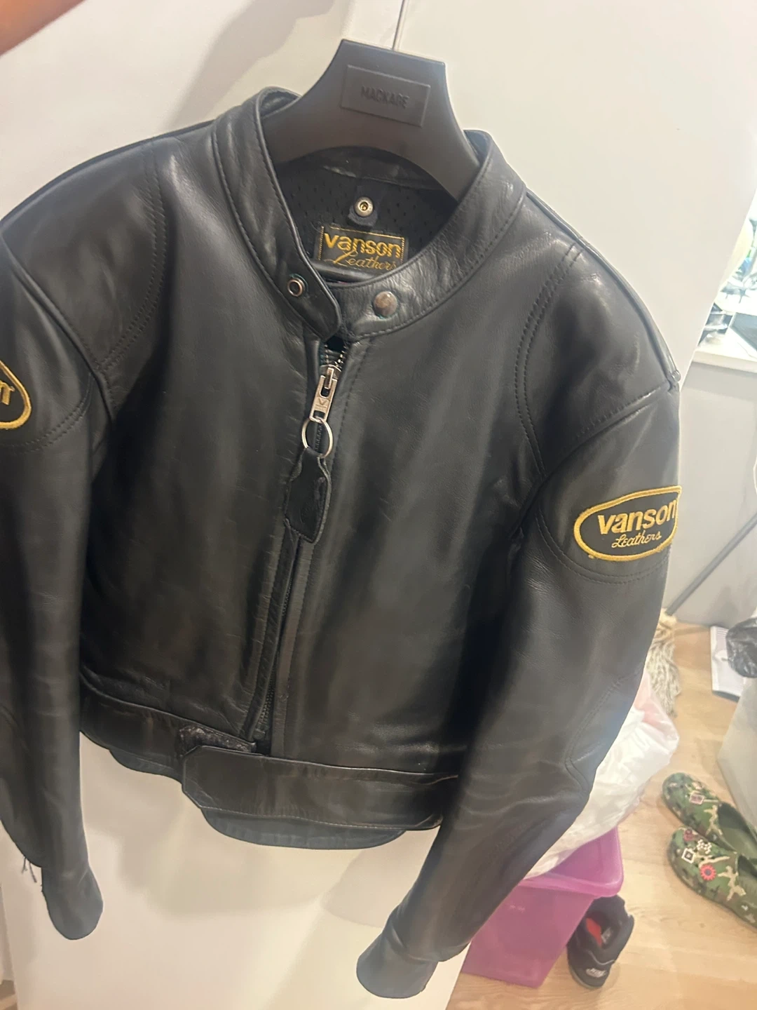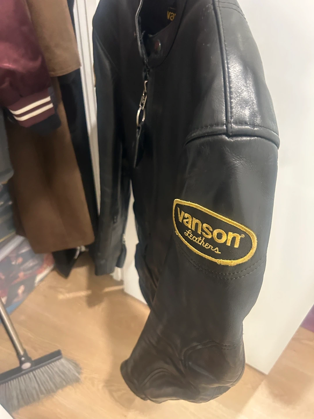 Selling a Vanson Leathers black leather jacket. It's in good condition and ready for a new owner. The jacket features the classic Vanson Leathers logo on the sleeve. Perfect for motorcycle riding or everyday wear!