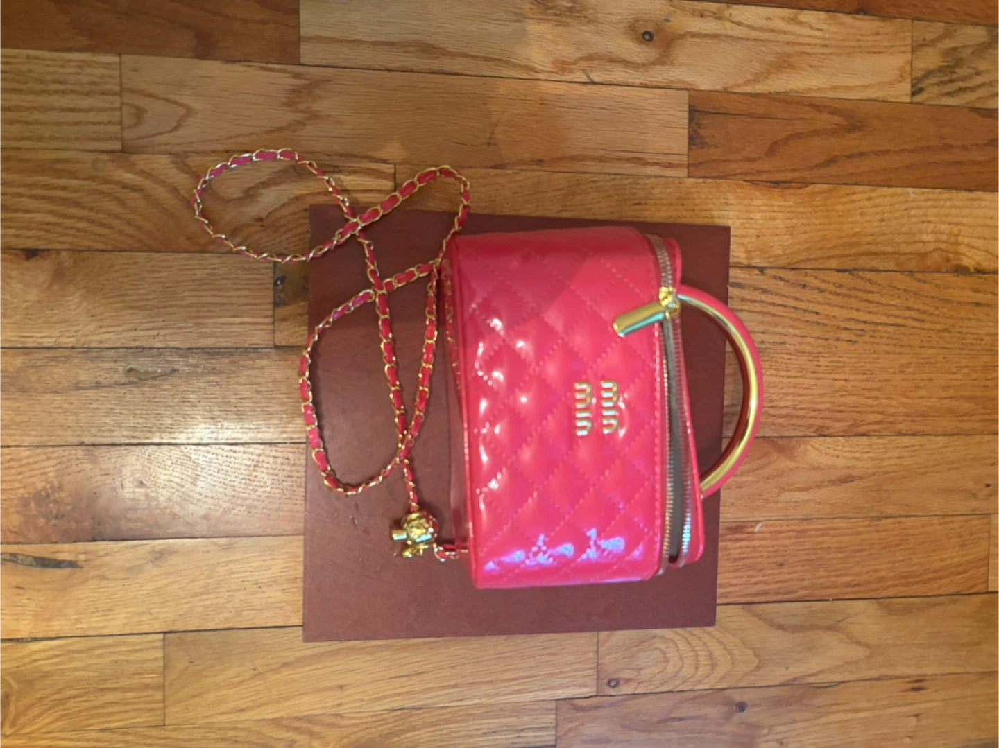This is a Miu Miu shoulder bag in a bright pink patent leather. It features a quilted design with gold-tone hardware and a chic chain strap. This bag is perfect for adding a pop of color to any outfit!