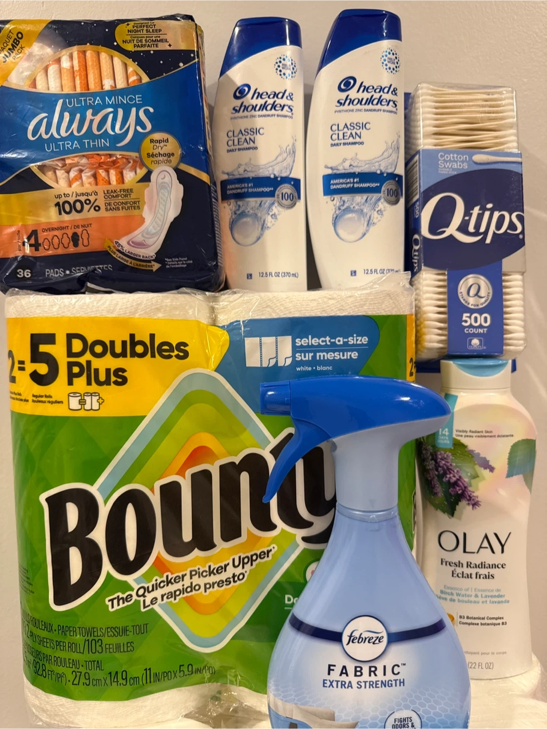 48I have a variety of household cleaning and personal care items for sale. Includes: - Always Ultra Thin Pads - Head & Shoulders Classic Clean Shampoo - Q-tips Cotton Swabs (500 count) - Bounty Paper Towels - Febreze Fabric Extra Strength - Olay Fresh Radiance Body Wash
