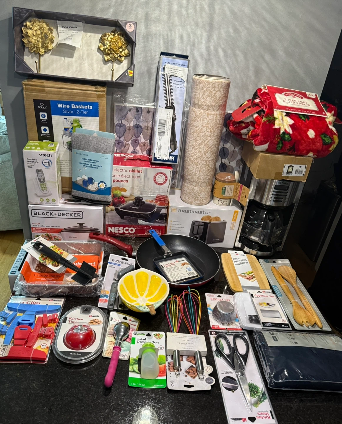 67A collection of various kitchenware and home goods, including a Nesco electric skillet, Black+Decker rice cooker and steamer, Toastmaster toaster, Farberware items, kitchen utensils, and more! There's also a VTech cordless telephone, Conair curl-smooth-style, and Holiday Times plush throw.