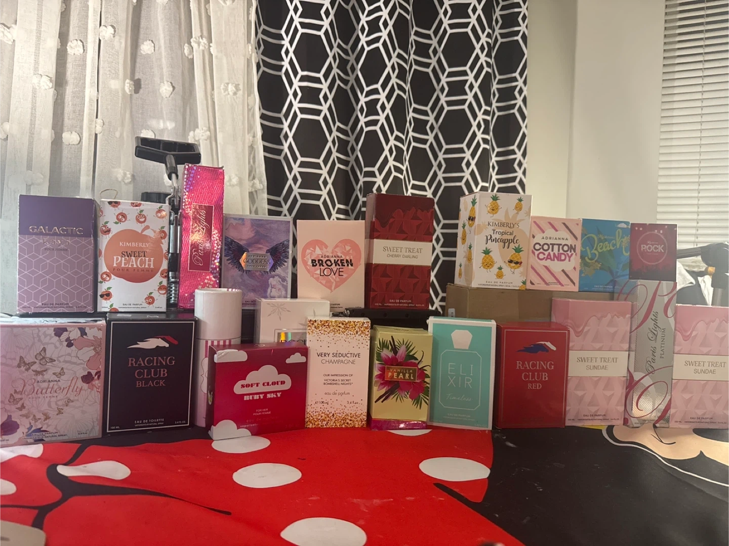 10I have a selection of perfumes for sale, including: - Kimberly Sweet Peach - Adriana Broken Love - Racing Club Black - Racing Club Red - And more!