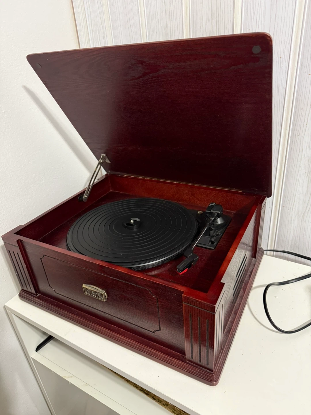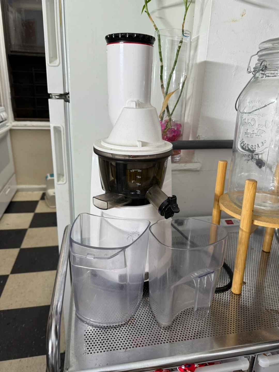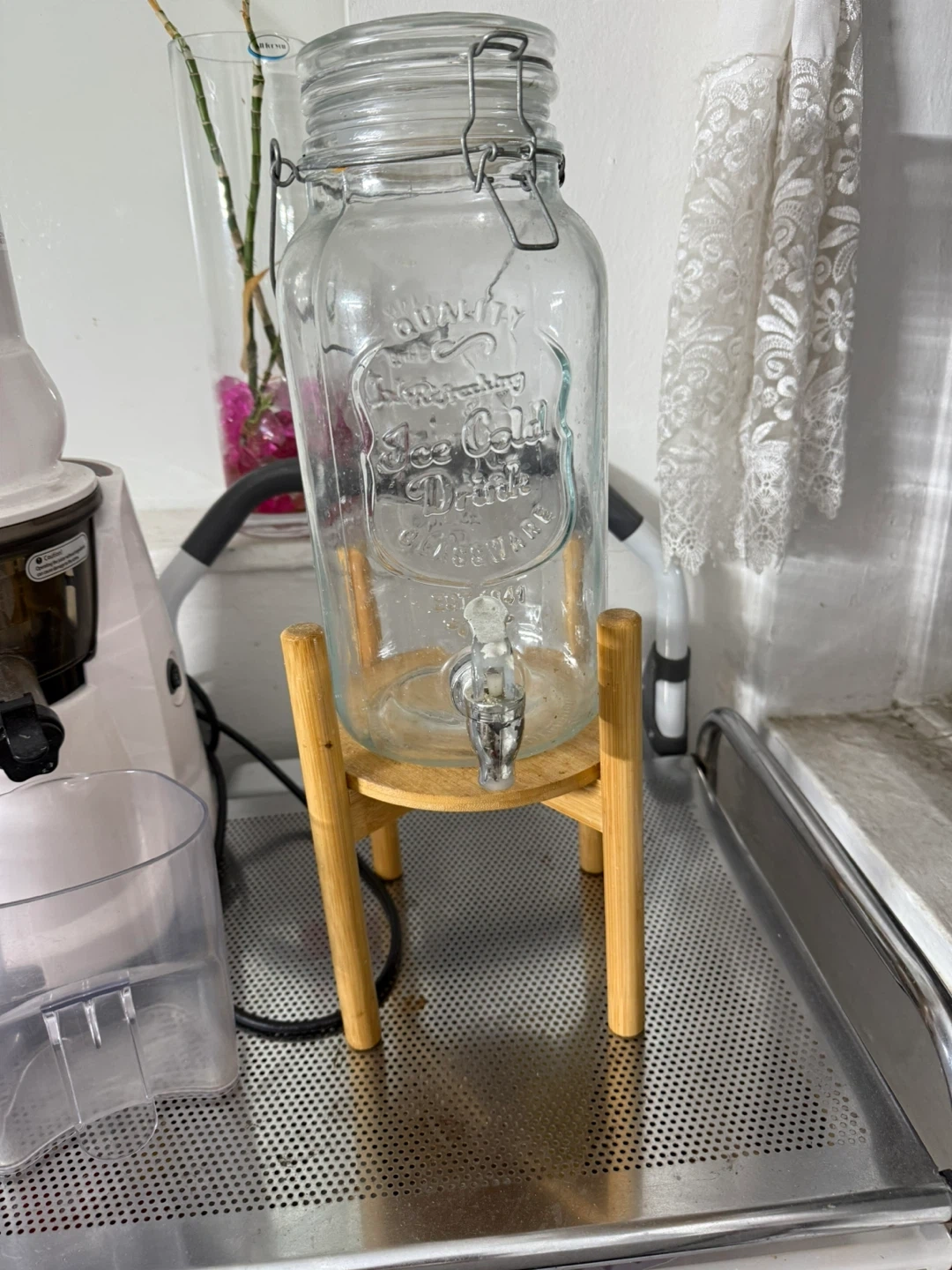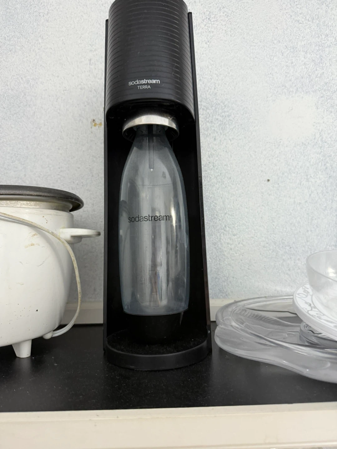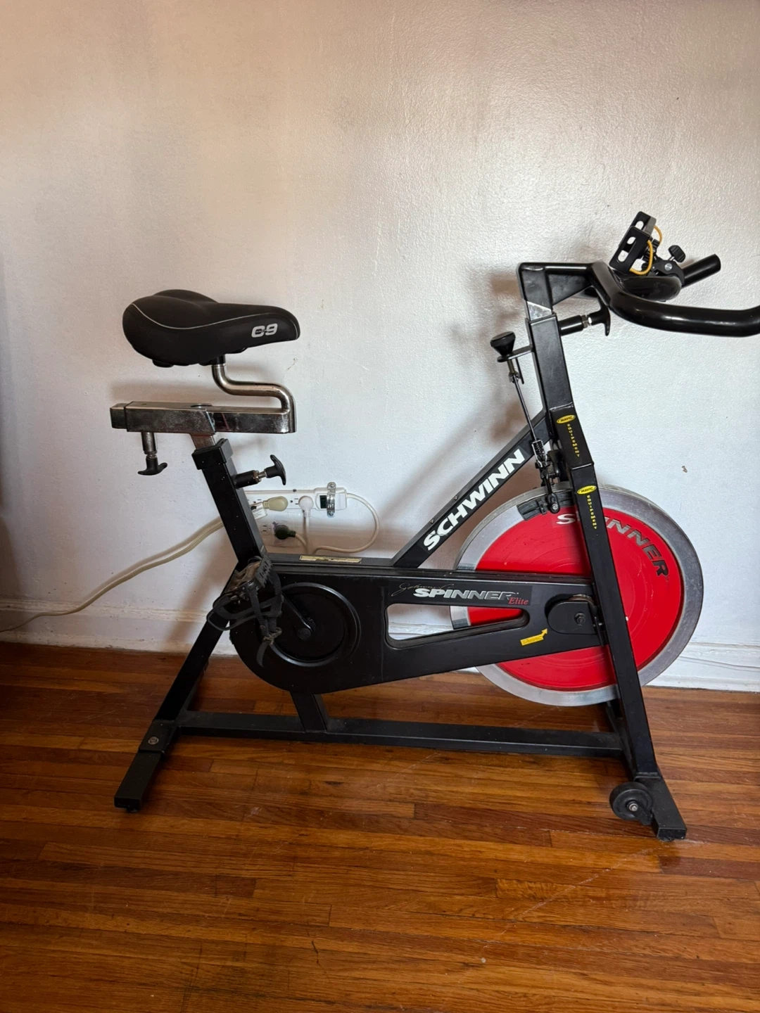 60A collection of household items available for sale: a juicer, a vinyl record player, a SodaStream Terra, a Schwinn exercise bike, and a glass drink dispenser with a wooden stand