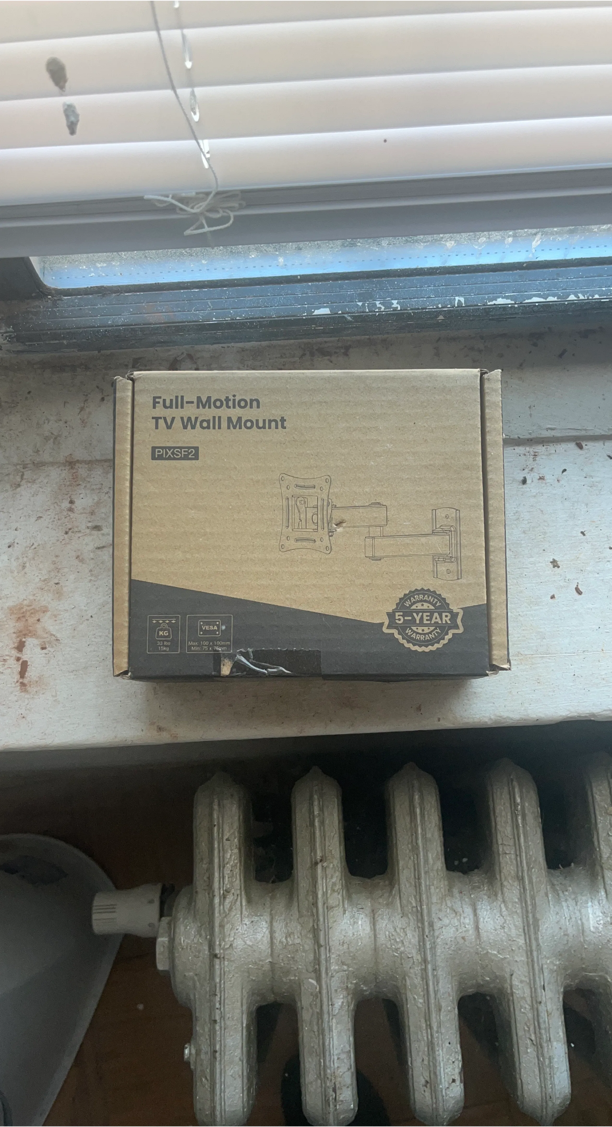 Selling a Full-Motion TV Wall Mount, model PIXSF2. It supports VESA with a max of 100 x 100mm and a min of 75 x 76mm. It can hold up to 33 lbs (15kg). The box is included and it has a 5-year warranty