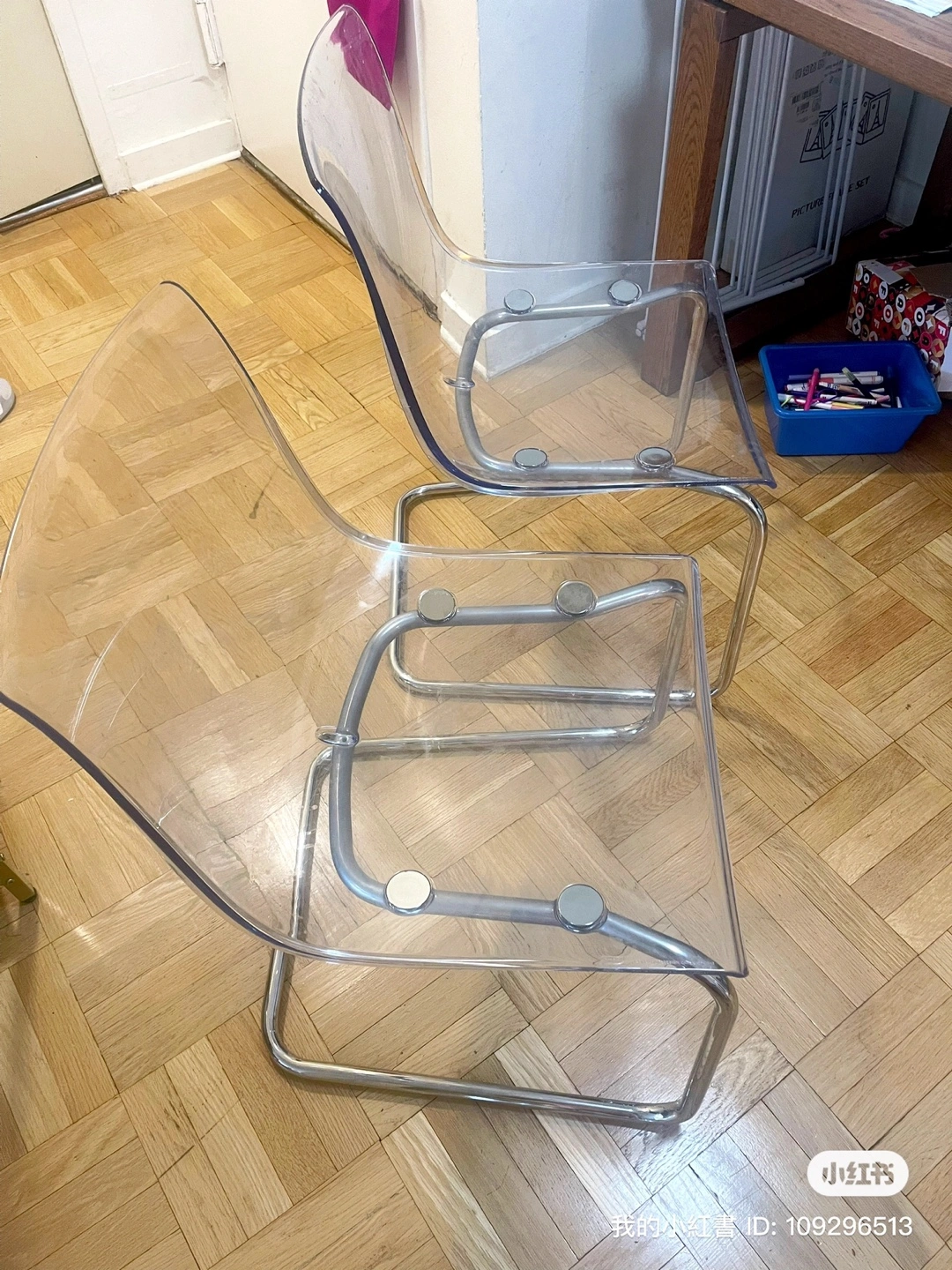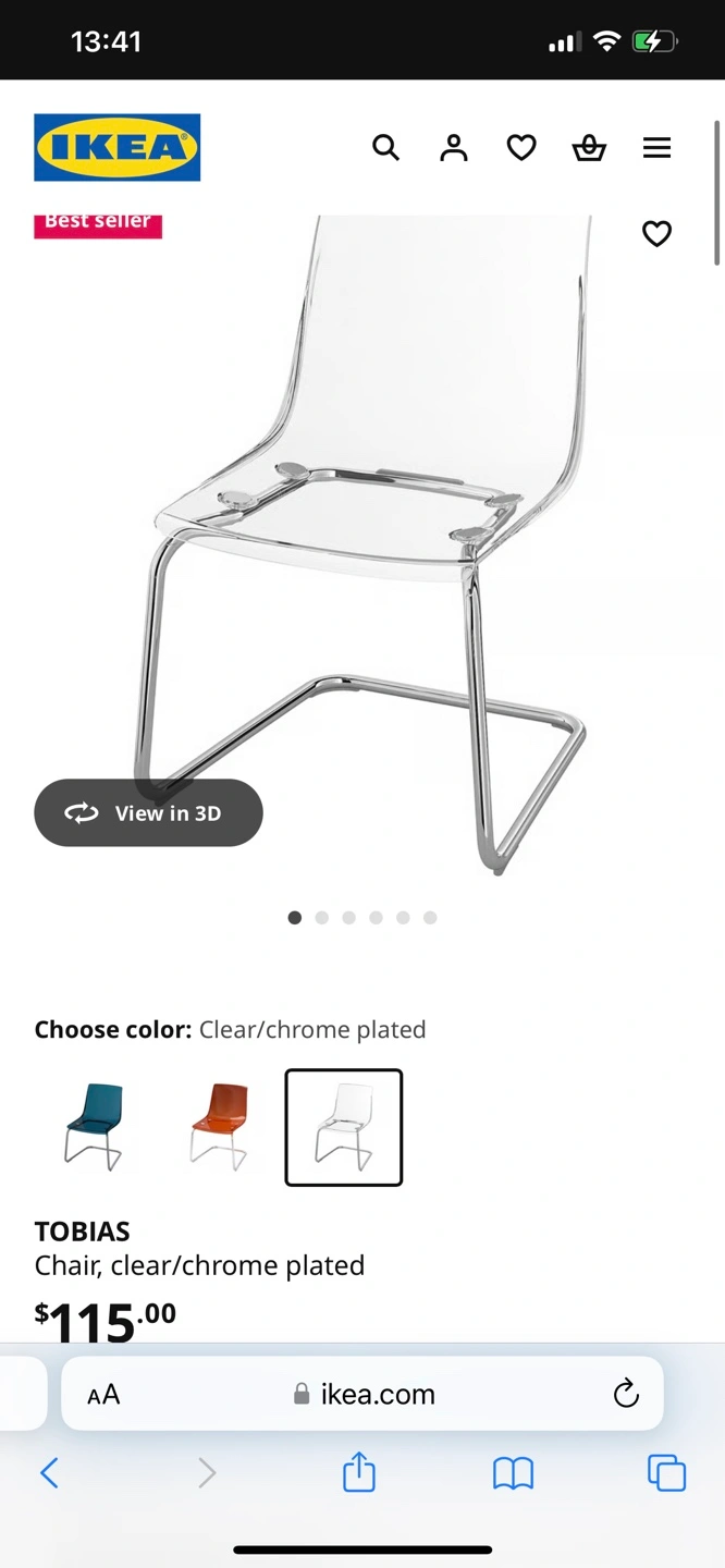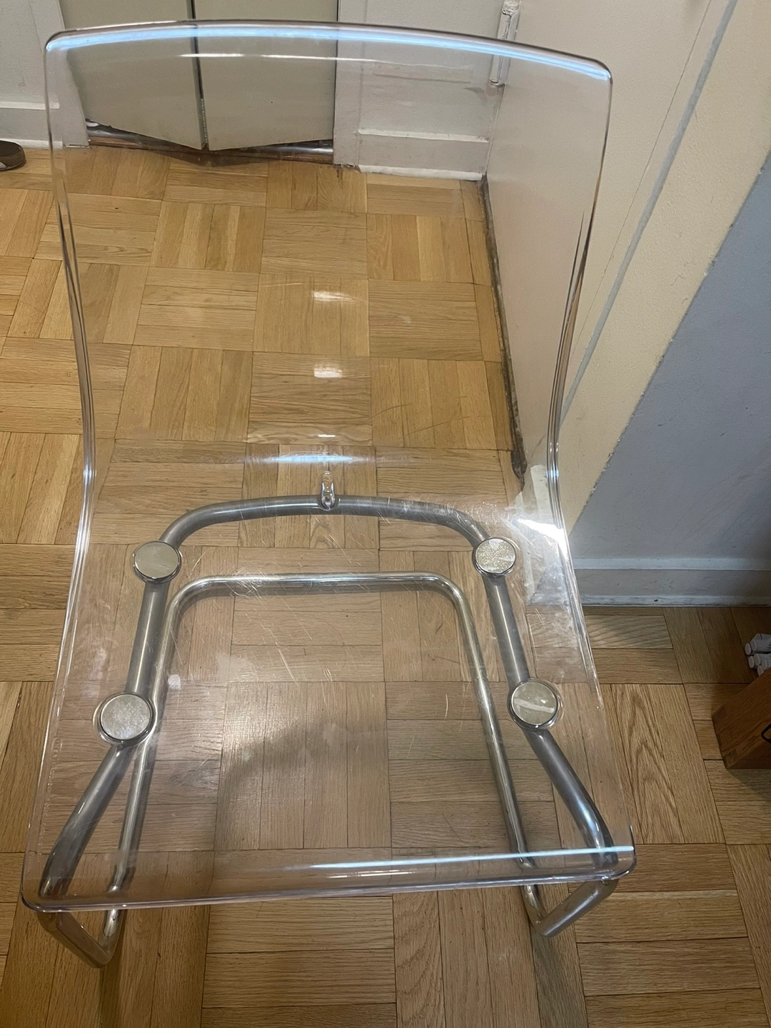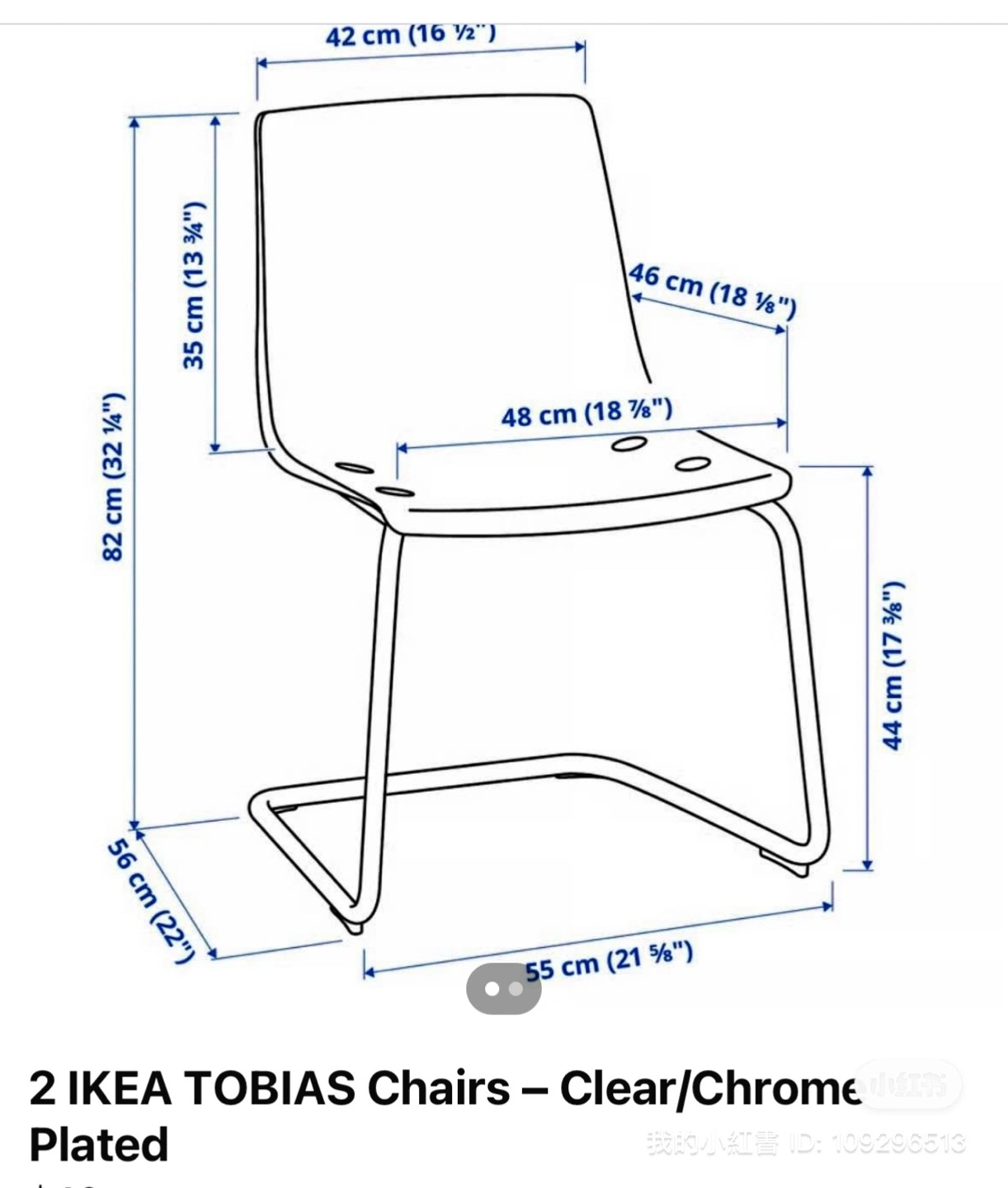 Selling an IKEA Tobias chair in clear with chrome-plated legs. It's a stylish and comfortable chair that fits well in any room. The dimensions are approximately 16 1/2" wide, 18 1/8" deep, and 32 1/4" high. Originally bought for $115