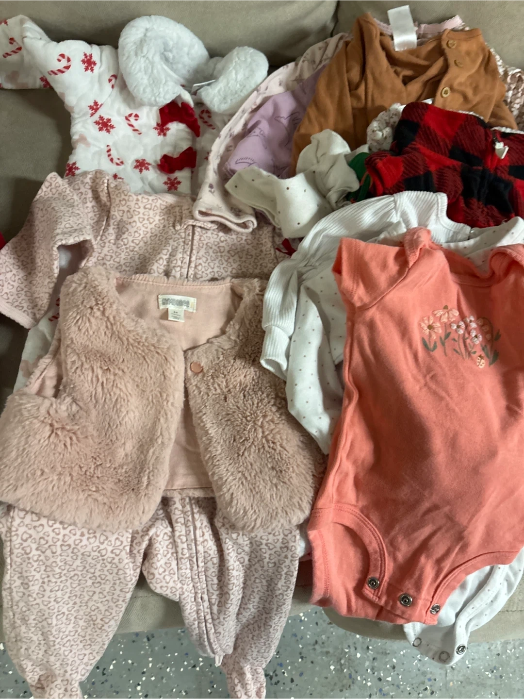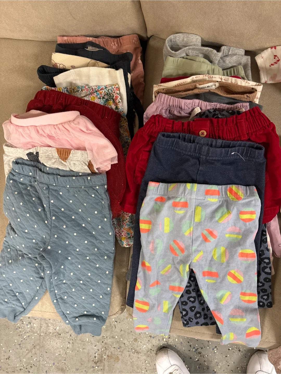 A collection of baby girl's clothing items. Includes onesies, pants, and other apparel. Various fabrics and patterns are present.