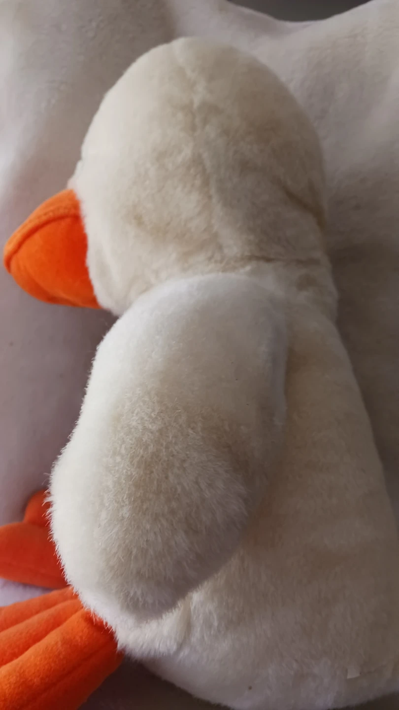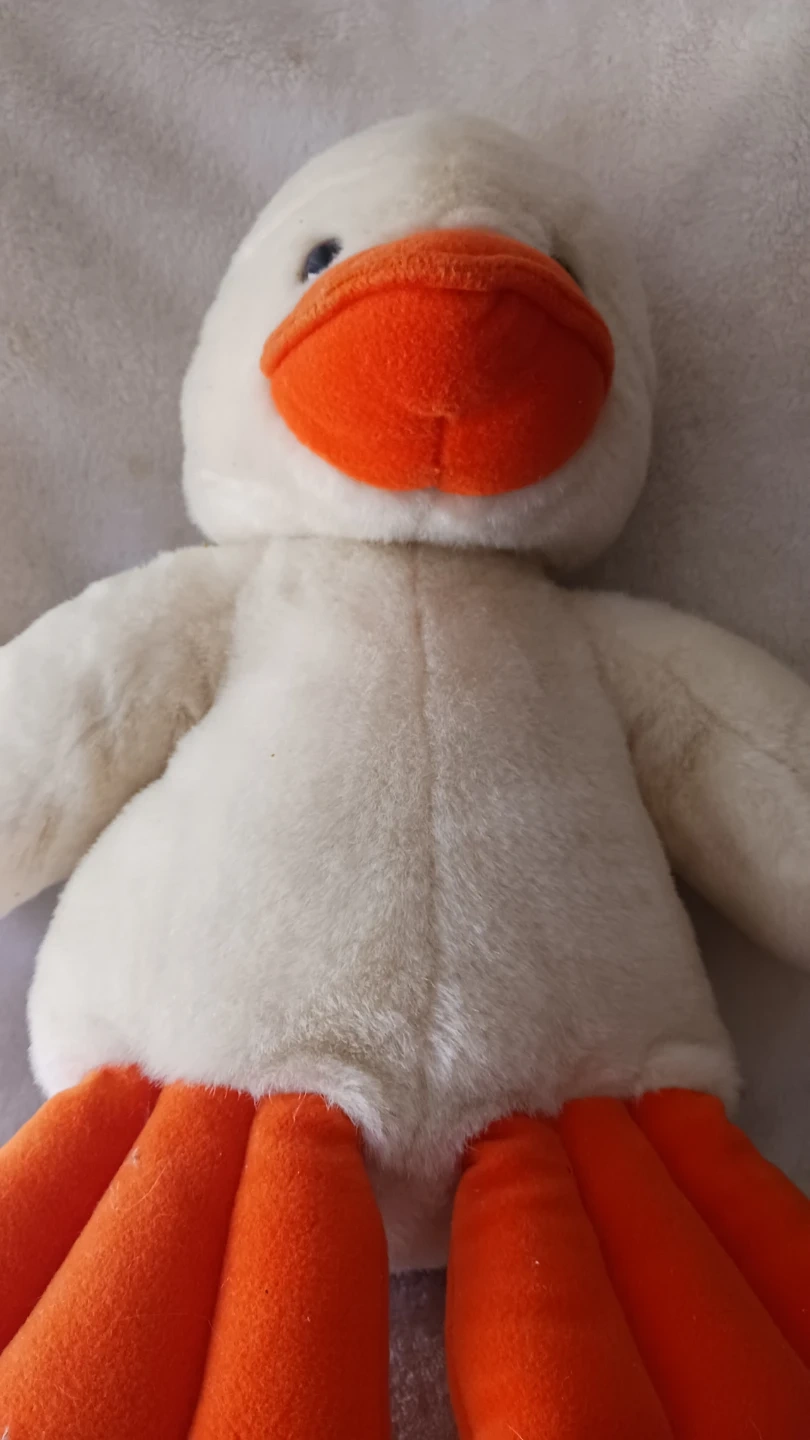 This is a soft, white plush duck stuffed animal with bright orange feet and beak. It's made of a fuzzy material and has blue eyes. Sadly it's rain coat & hat had to be removed because of rubber determination. Still great value, original price $49. 10" tall &10" from toe too tail! A cuddly companion for all ages!