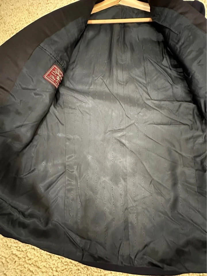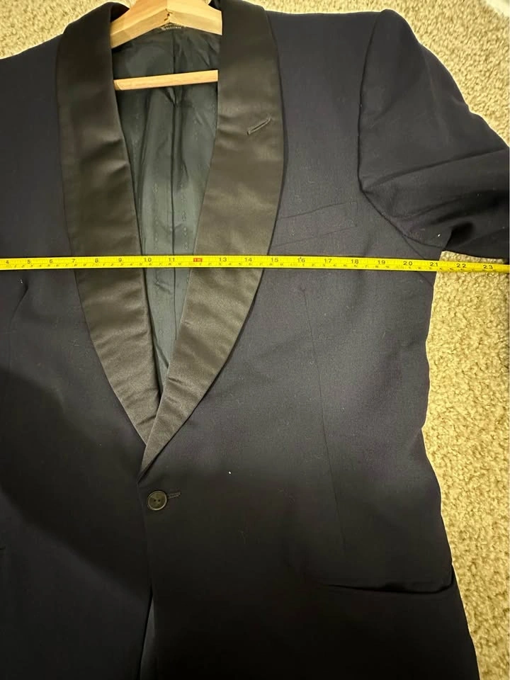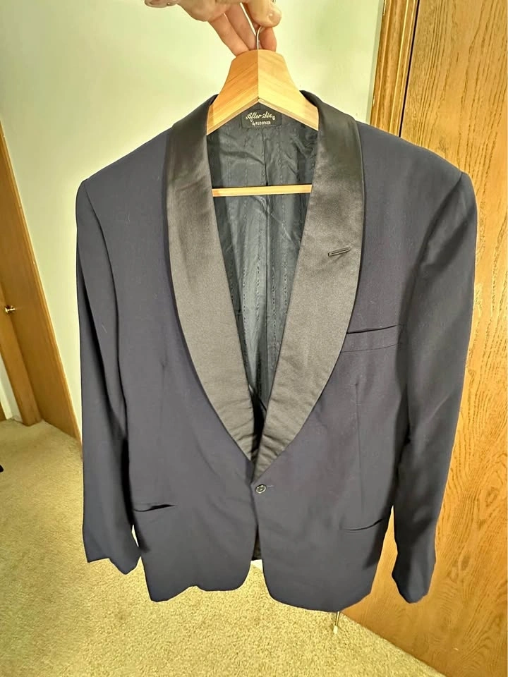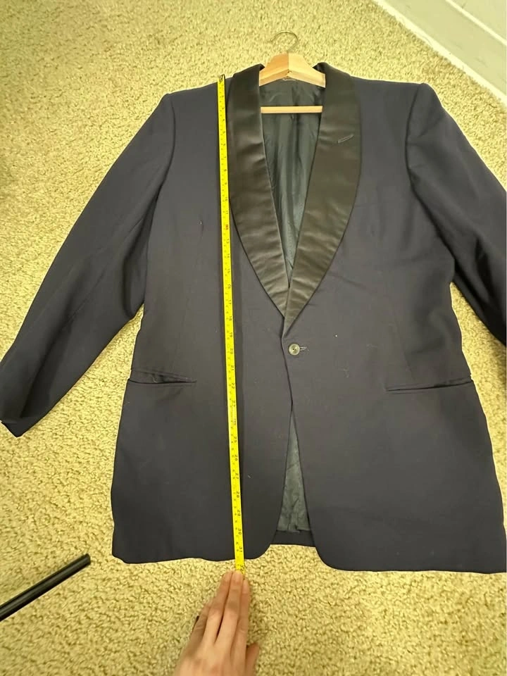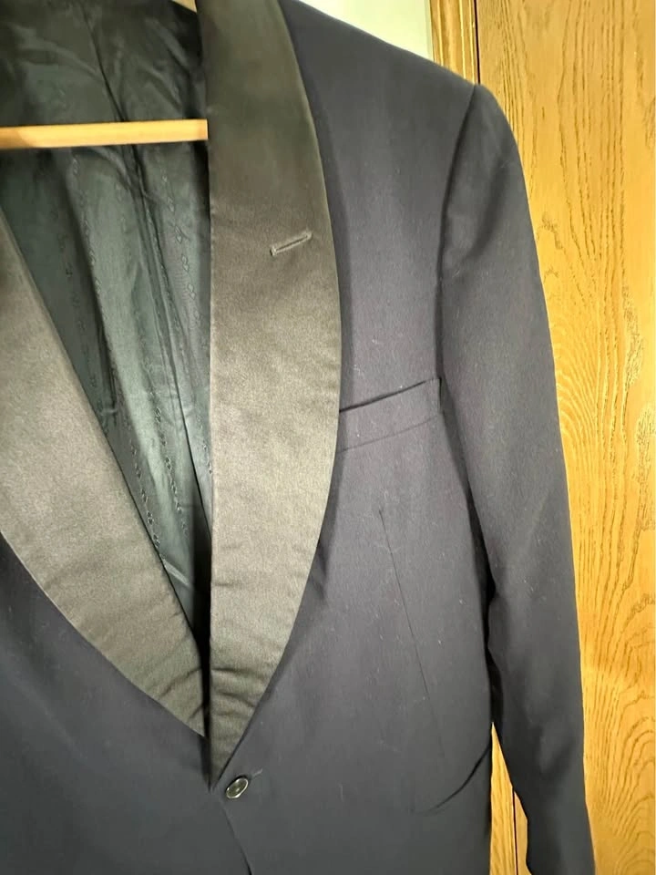 Men’s Dark Blue tuxedo blazer with satin shawl lapel. Classic formal style, perfect for weddings, events, or evening wear. Brand: Donleigh’s “The Erie” (Chicago / Oak Park). Color: Dark Blue. Style: Tuxedo blazer with satin shawl lapel. Single-button front. Fully lined. Condition: Good overall, light signs of wear (see photos). Size: Men’s Small (please see measurements). Measurements (approx): Length: ~30”, Pit to pit: ~21–22”, Sleeve length: ~25–26”, Shoulder: ~6–7” (from collar). Clean and ready to wear. Pickup in Buffalo Grove.