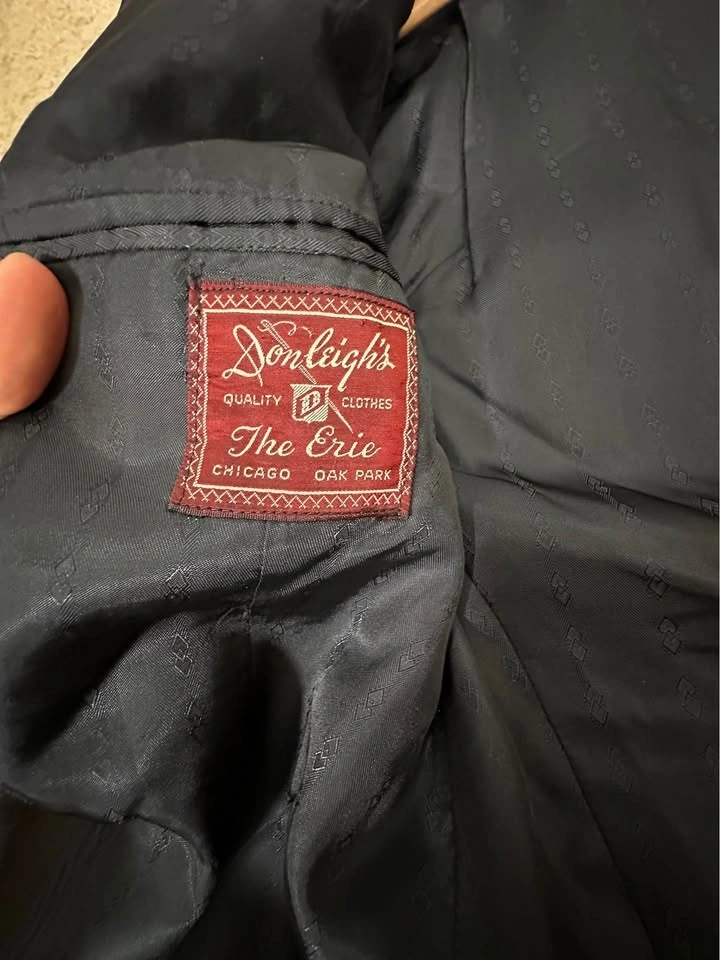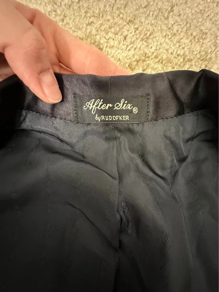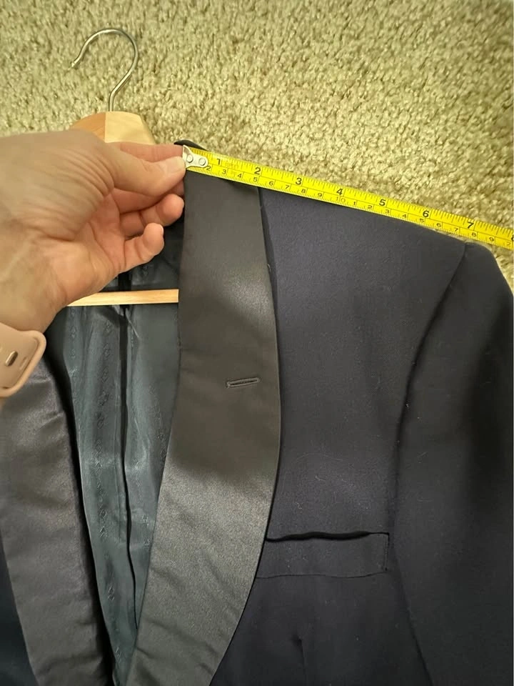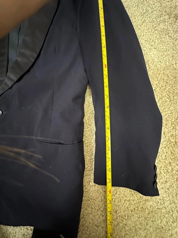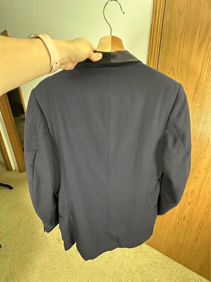 Men’s Dark Blue tuxedo blazer with satin shawl lapel. Classic formal style, perfect for weddings, events, or evening wear. Brand: Donleigh’s “The Erie” (Chicago / Oak Park). Color: Dark Blue. Style: Tuxedo blazer with satin shawl lapel. Single-button front. Fully lined. Condition: Good overall, light signs of wear (see photos). Size: Men’s Small (please see measurements). Measurements (approx): Length: ~30”, Pit to pit: ~21–22”, Sleeve length: ~25–26”, Shoulder: ~6–7” (from collar). Clean and ready to wear. Pickup in Buffalo Grove.
