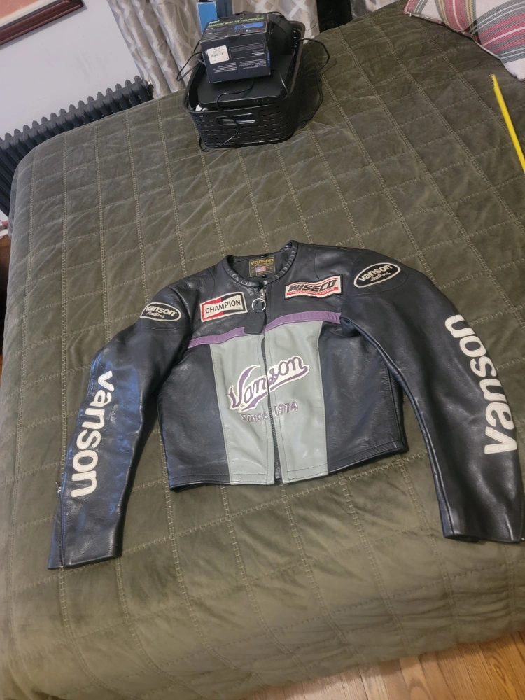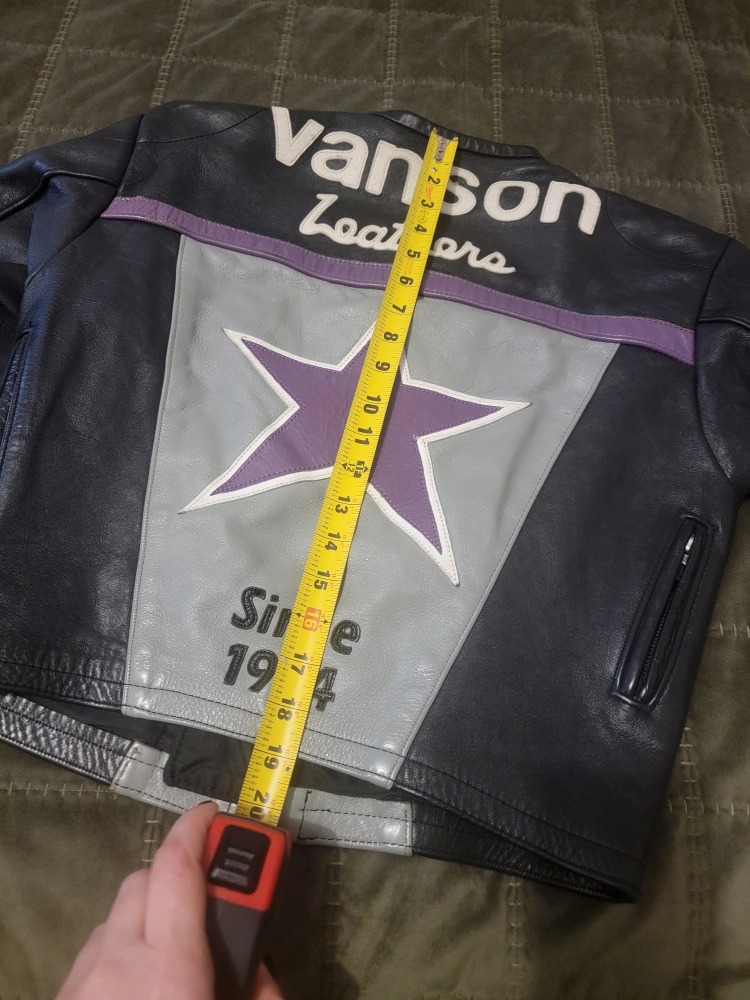Selling a Vanson leather racing jacket. It features the Vanson logo on the front and sleeves, with a gray and black color scheme and purple accents. Based on the photos, it measures approximately 17 inches across the front and 23 inches in sleeve length. Great for any racing enthusiast!
