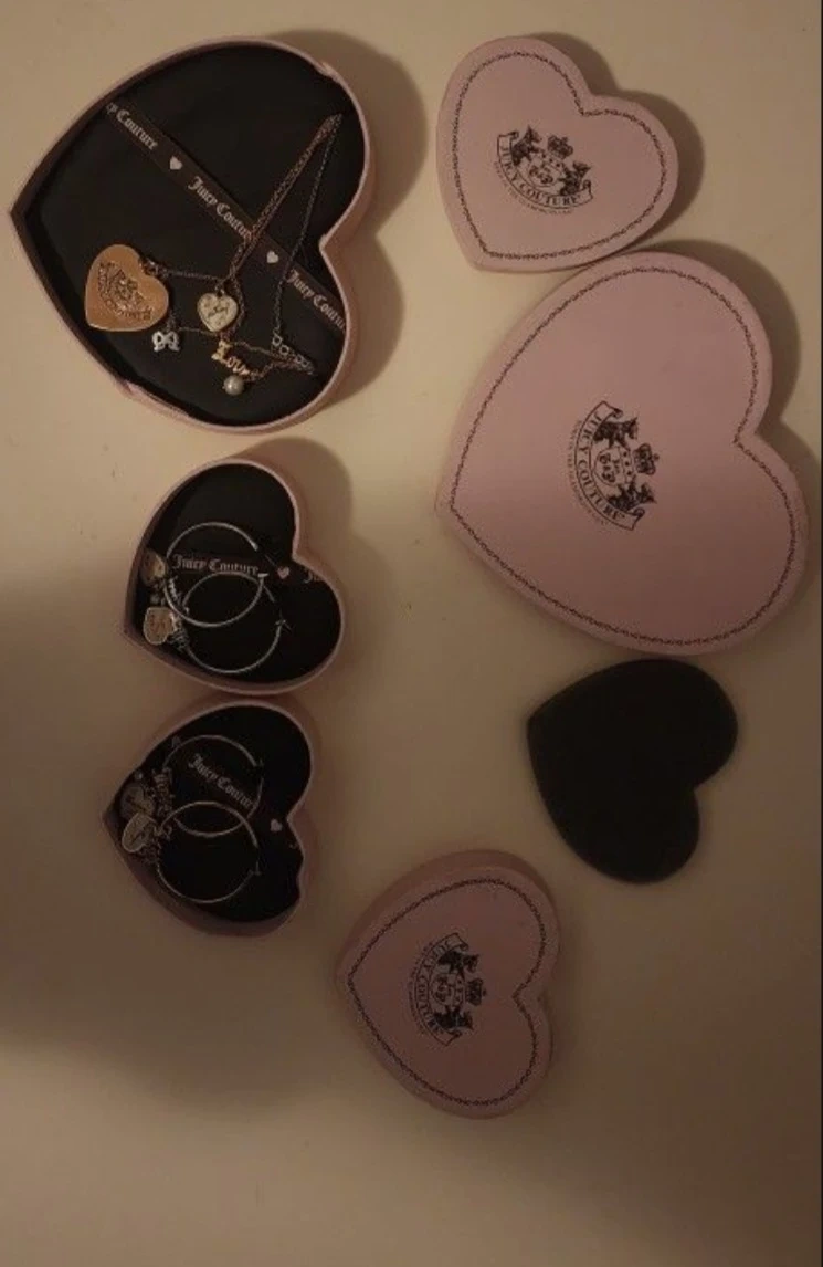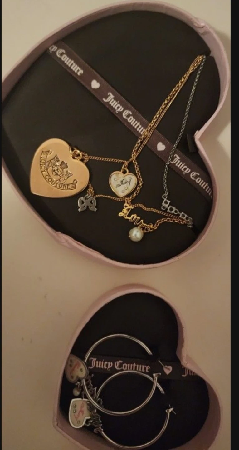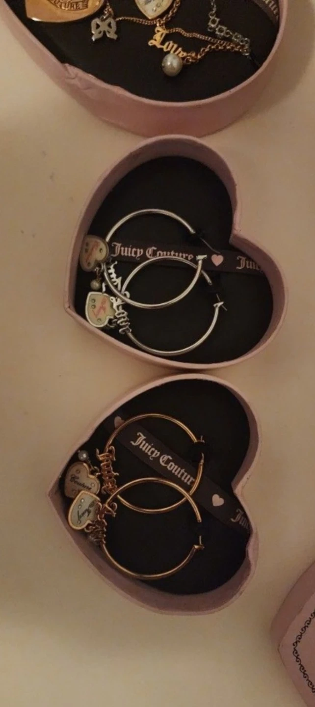 This set includes a Juicy Couture necklace with heart charms and two pairs of hoop earrings, one gold tone and one silver tone. All pieces come in heart-shaped gift boxes.