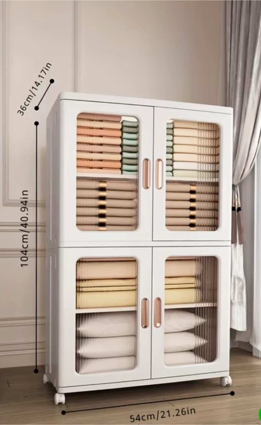 This is a white storage cabinet with doors. It has a height of approximately 40.94 inches (104cm), a width of 21.26 inches (54cm), and a depth of 14.17 inches (36cm). It's perfect for organizing your belongings!