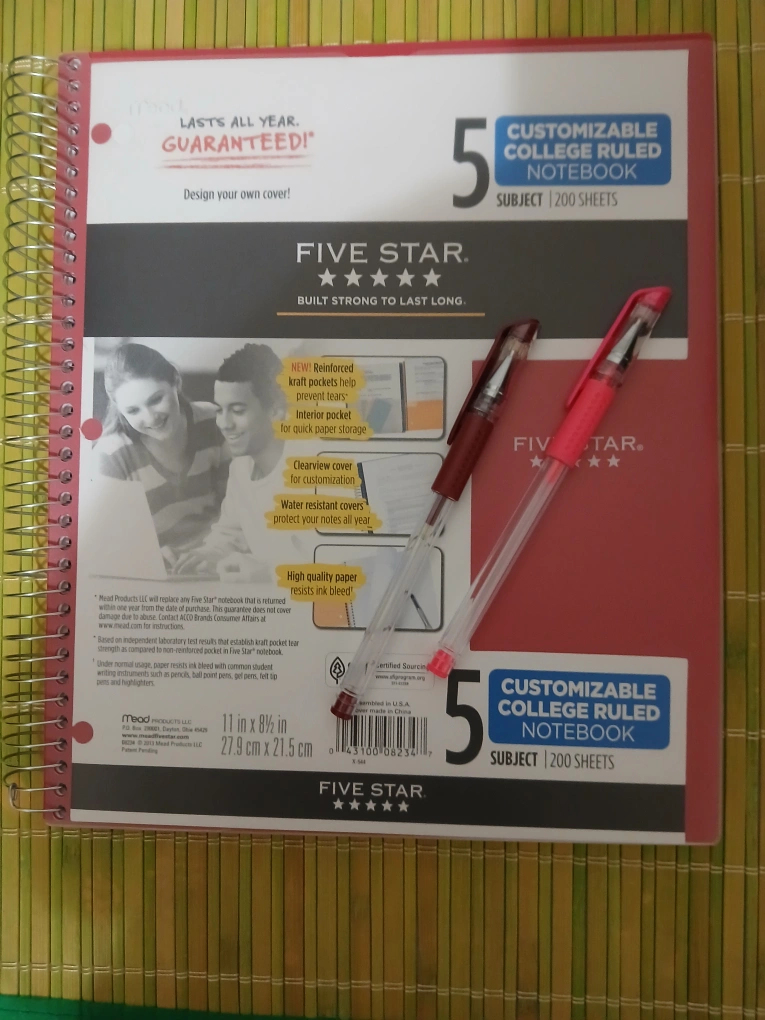 I have a Five Star college-ruled notebook with 200 sheets. It's customizable, so you can design your own cover! This notebook is built strong to last long and features reinforced kraft pockets to help prevent tears, as well as an interior pocket for quick paper storage. The clearview cover allows for customization, and the water-resistant covers protect your notes all year