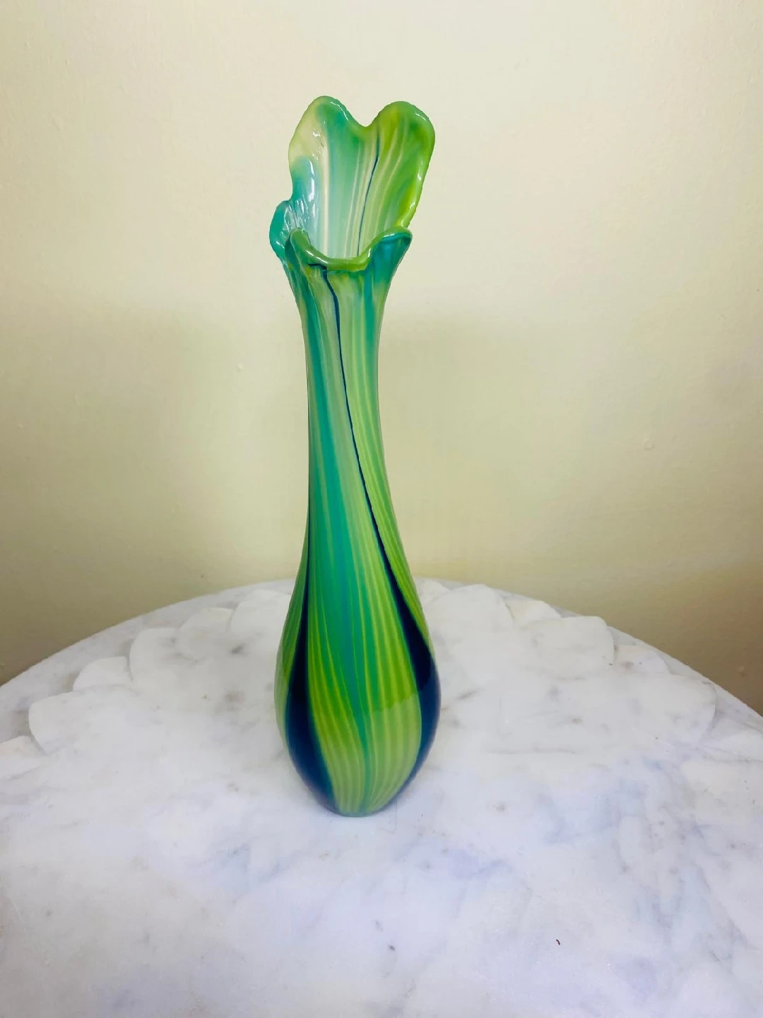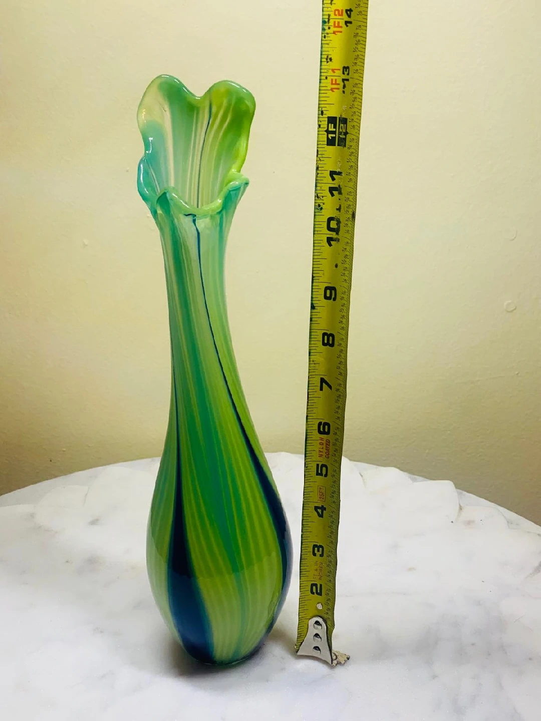 Beautiful art glass vase with a unique green and blue swirl design. It stands approximately 11 inches tall. Perfect for adding a pop of color to any room!