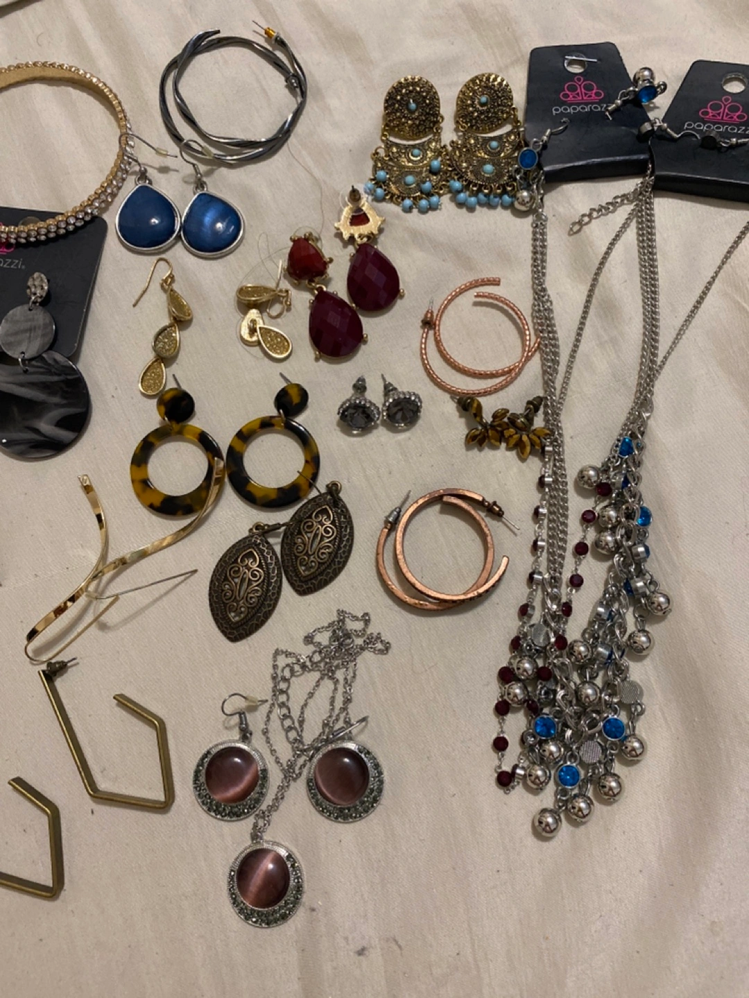 Selling a mixed lot of earrings and other jewelry pieces! There's a variety of styles and colors to choose from, including pieces from Forever 21 and Paparazzi. Perfect for adding some sparkle to your outfits!