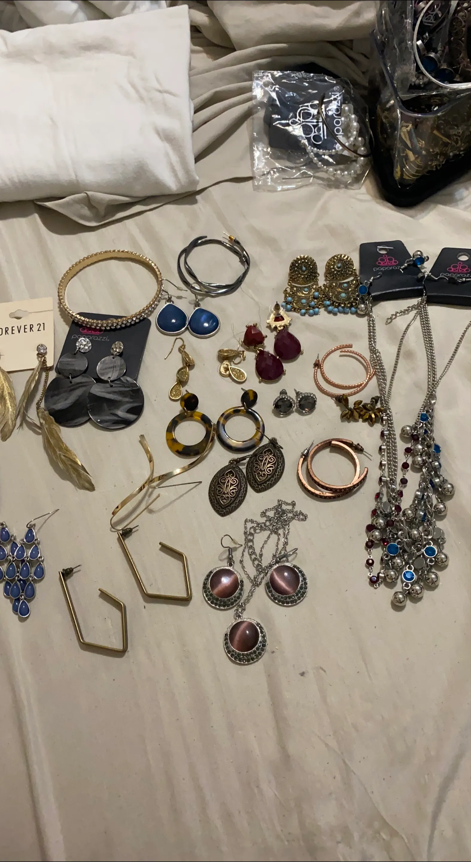 Selling a mixed lot of earrings and other jewelry pieces! There's a variety of styles and colors to choose from, including pieces from Forever 21 and Paparazzi. Perfect for adding some sparkle to your outfits!